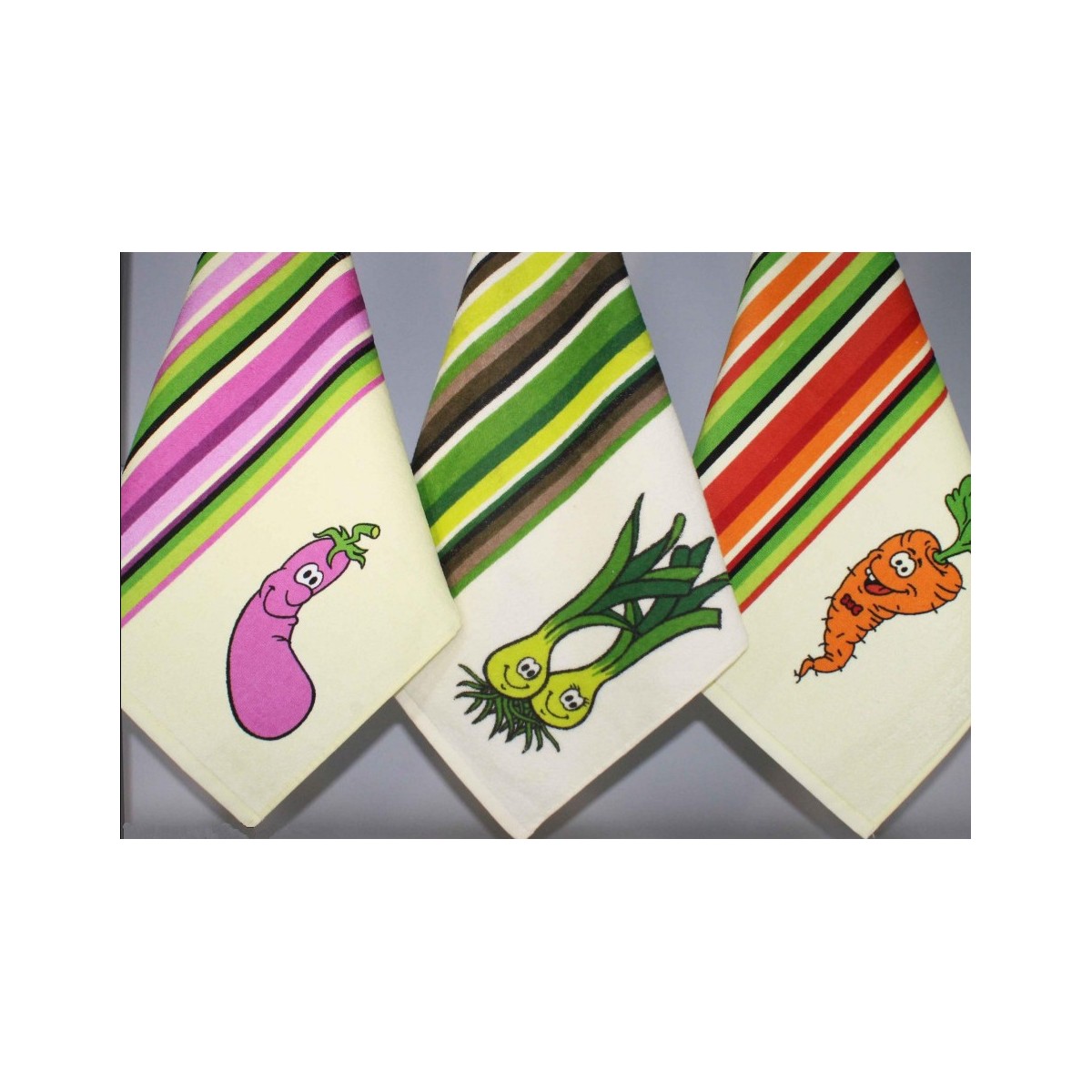 Descubre el Paño Cocina VEGETALES, un producto único y divertido que aportará un toque de alegría a tu cocina. Fabricado en 100% algodón, este paño combina funcionalidad y estilo, presentando un diseño encantador con ilustraciones de verduras que harán que tus tareas culinarias sean más amenas. Disponible en tres colores vibrantes, cada paño cuenta con un fondo claro que resalta los detalles coloridos de las verduras, incluyendo una berenjena, cebollitas y una zanahoria, acompañados de rayas multicolores que añaden un toque moderno.