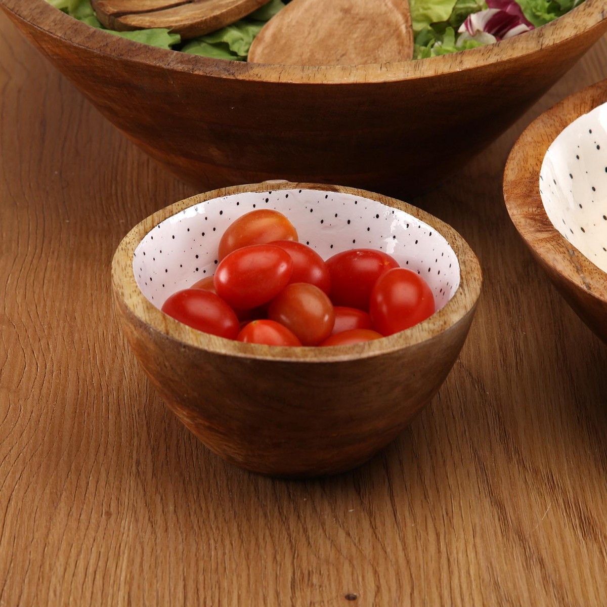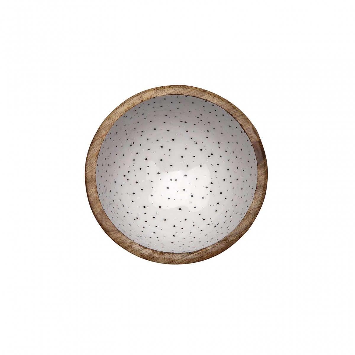 Con el bol SPECKLE, tu mesa se transformará en un espacio elegante y acogedor. Este atractivo bol de madera de mango combina un diseño funcional con un estilo moderno, ideal para servir ensaladas, aperitivos o frutas. Su interior esmaltado en blanco con pequeños puntos negros aporta un toque de originalidad, mientras que el acabado exterior de la madera resalta su textura natural, creando un equilibrio perfecto entre rusticidad y sofisticación.
