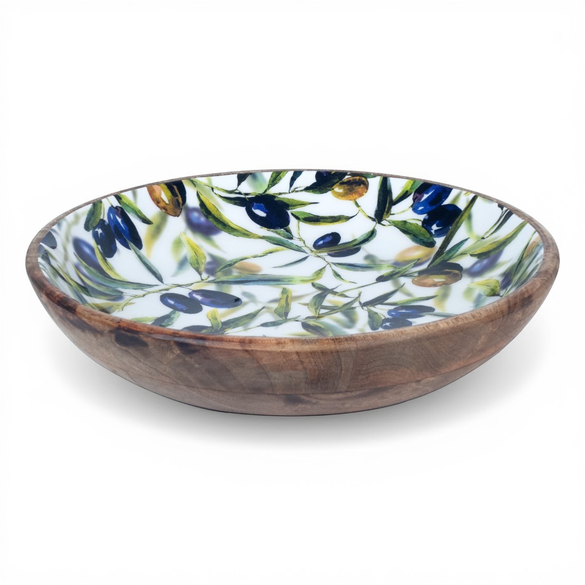 Visualmente, el plato destaca por su acabado en madera de mango, que brinda un aspecto cálido y natural. El interior está decorado con un delicado diseño de aceitunas en tonos azul oscuro y dorado, rodeadas de un verde vibrante que simula las hojas. Esta combinación de colores no solo es visualmente atractiva, sino que también aporta un aire fresco y natural a tu mesa. La forma honda del plato permite que tus alimentos se mantengan en el centro, evitando derrames y asegurando una presentación impecable.
