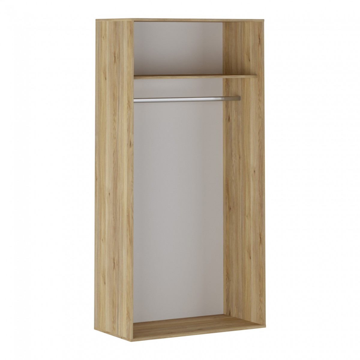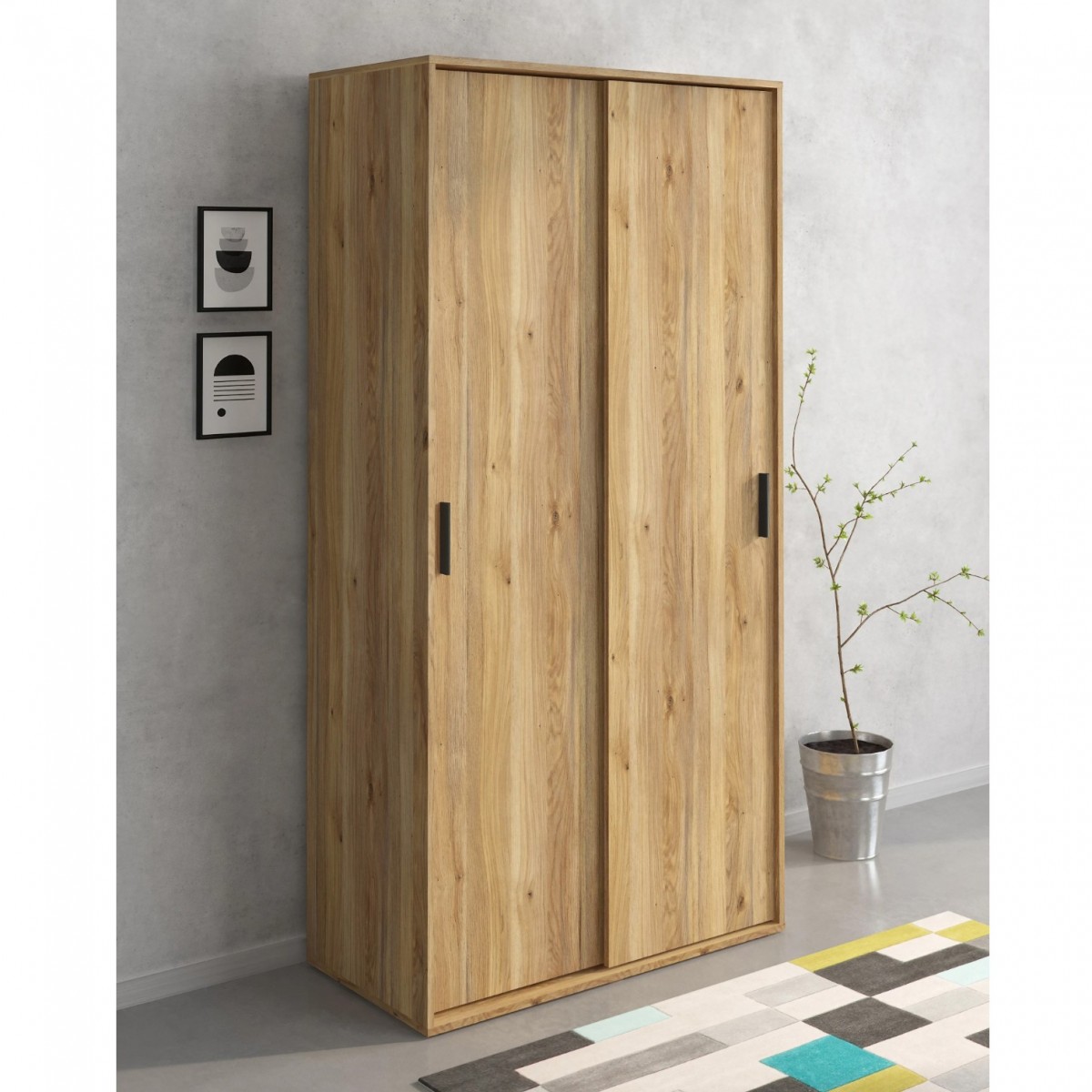 Visualmente, el armario presenta un acabado en melamina de alta calidad que simula la textura de la madera, brindando un aspecto natural y acogedor. Las puertas, con un diseño minimalista, se complementan con tiradores negros que añaden un toque contemporáneo. Con unas dimensiones generosas de 200 cm de alto, 100 cm de ancho y 49.8 cm de profundidad, el armario AURA ofrece un amplio espacio para almacenar ropa y otros objetos, manteniendo tu hogar organizado y ordenado.