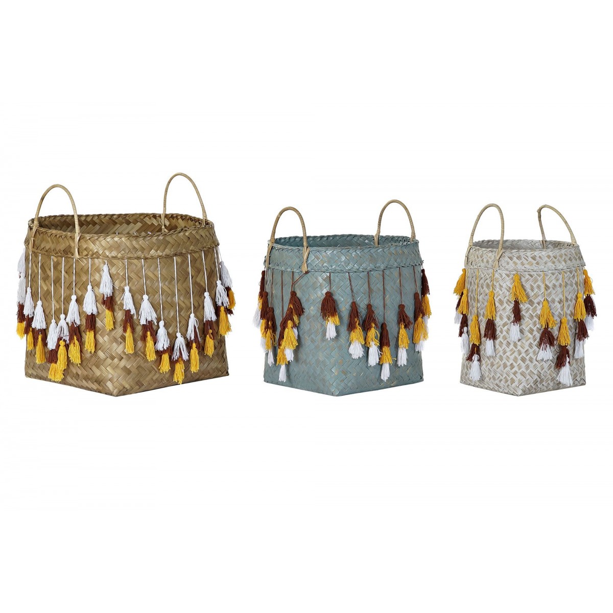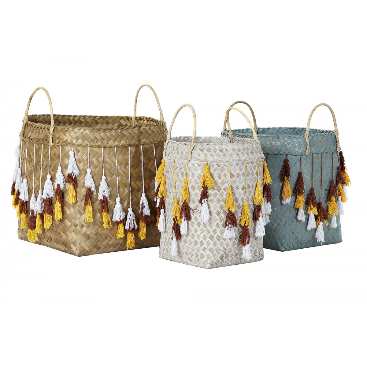 En cuanto a las características técnicas, la Cesta FLEKO mediana está fabricada con materiales de alta calidad que garantizan su durabilidad. Su estructura es resistente, lo que la hace ideal para almacenar una amplia gama de objetos, desde juguetes hasta ropa. Las dimensiones de la cesta permiten un uso práctico, mientras que los detalles decorativos, como los borlones de colores en tonos amarillos, marrones y blancos, añaden un elemento visual atractivo. Los asas de cuerda facilitan su transporte, convirtiéndola en una opción funcional y estilizada.