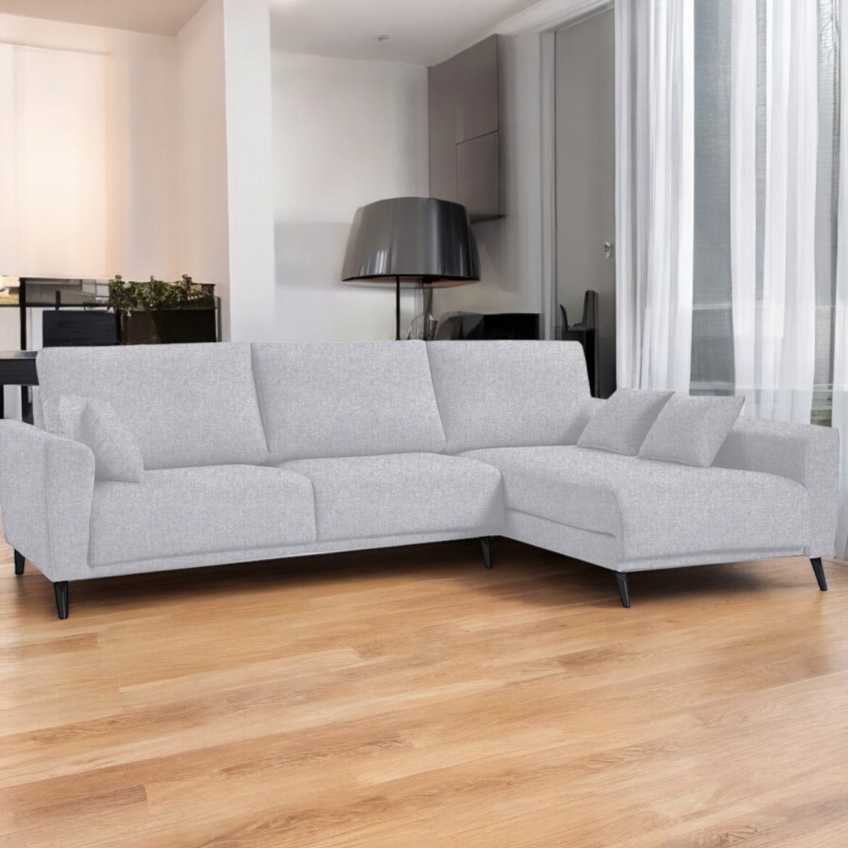 La Chaiselongue AMATISTA derecha marfil es una pieza elegante y contemporánea que aportará un toque de distinción a cualquier salón. Su diseño moderno se complementa con un acabado en color marfil, que ofrece una sensación de luminosidad y amplitud en el ambiente. Las patas altas en color negro no solo añaden un contraste visual atractivo, sino que también permiten una fácil limpieza del espacio bajo el sofá, manteniendo su estética impecable.
