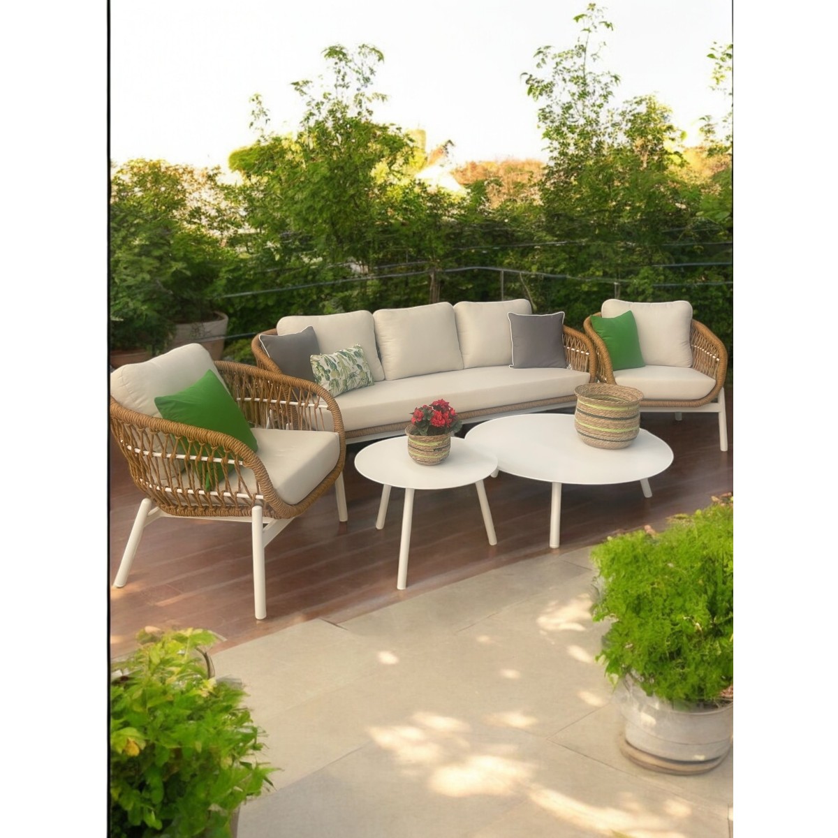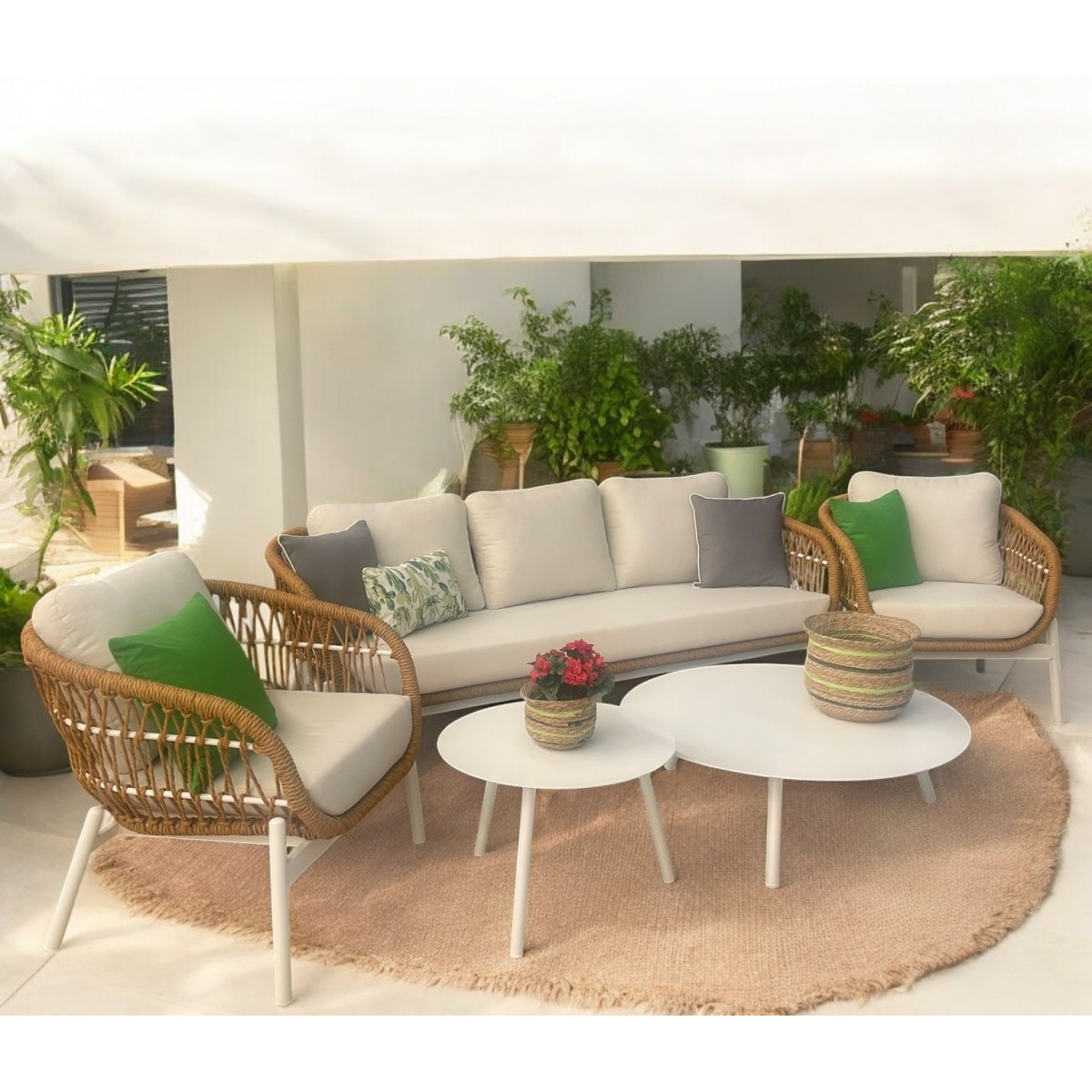Visualmente, el Set Marsella destaca por su estructura en tonos naturales, con un acabado en ratán que envuelve los sillones, creando un efecto visual cálido y acogedor. Los cojines, en colores neutros como el beige, se complementan con acentos en verde y gris, aportando un contraste atractivo. Las mesas, de líneas sencillas y minimalistas, presentan un acabado blanco que resalta la frescura del conjunto, ideal para disfrutar de momentos al aire libre.