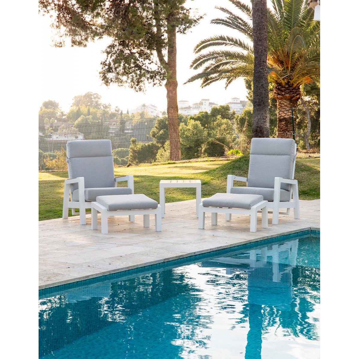 - Conjunto de 5 piezas: incluye dos butacas reclinables, dos reposapiés y una mesa auxiliar.