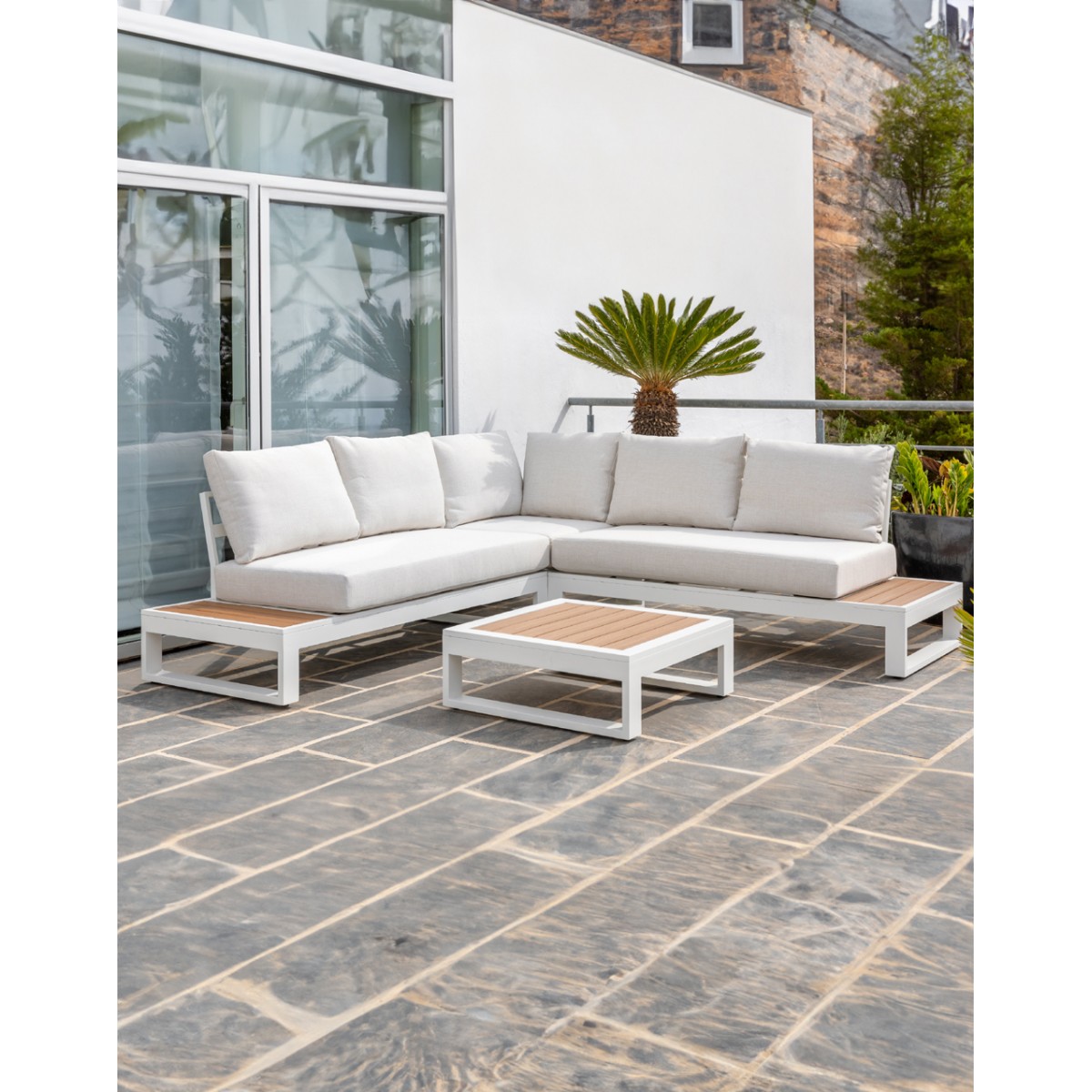 Visualmente, la Rinconera BERLIN destaca por sus cojines de color crudo, que ofrecen un contraste suave con la estructura blanca. Los cojines son desenfundables, lo que facilita su limpieza y mantenimiento. La mesa central y los laterales están elaborados en polywood, un material que simula la madera y proporciona un acabado elegante y resistente a las inclemencias del tiempo. Las líneas limpias y el diseño minimalista hacen que este set sea un complemento perfecto para cualquier estilo decorativo.