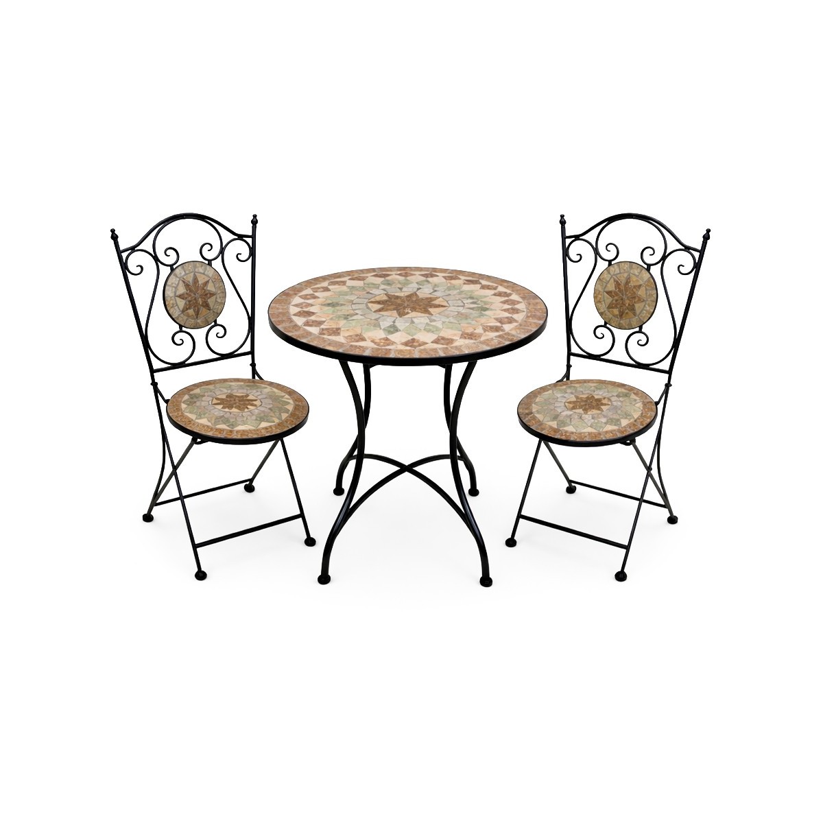 Visualmente, la mesa mide 60 cm de diámetro y 71 cm de altura, lo que la hace perfecta para disfrutar de un café o una comida ligera. Las sillas, con un tamaño de 39 cm de ancho y 92 cm de alto, son cómodas y están diseñadas para ofrecer un soporte óptimo. El contraste entre el mosaico de la mesa y la estructura metálica negra crea un efecto visual muy atractivo, ideal para complementar cualquier decoración exterior.