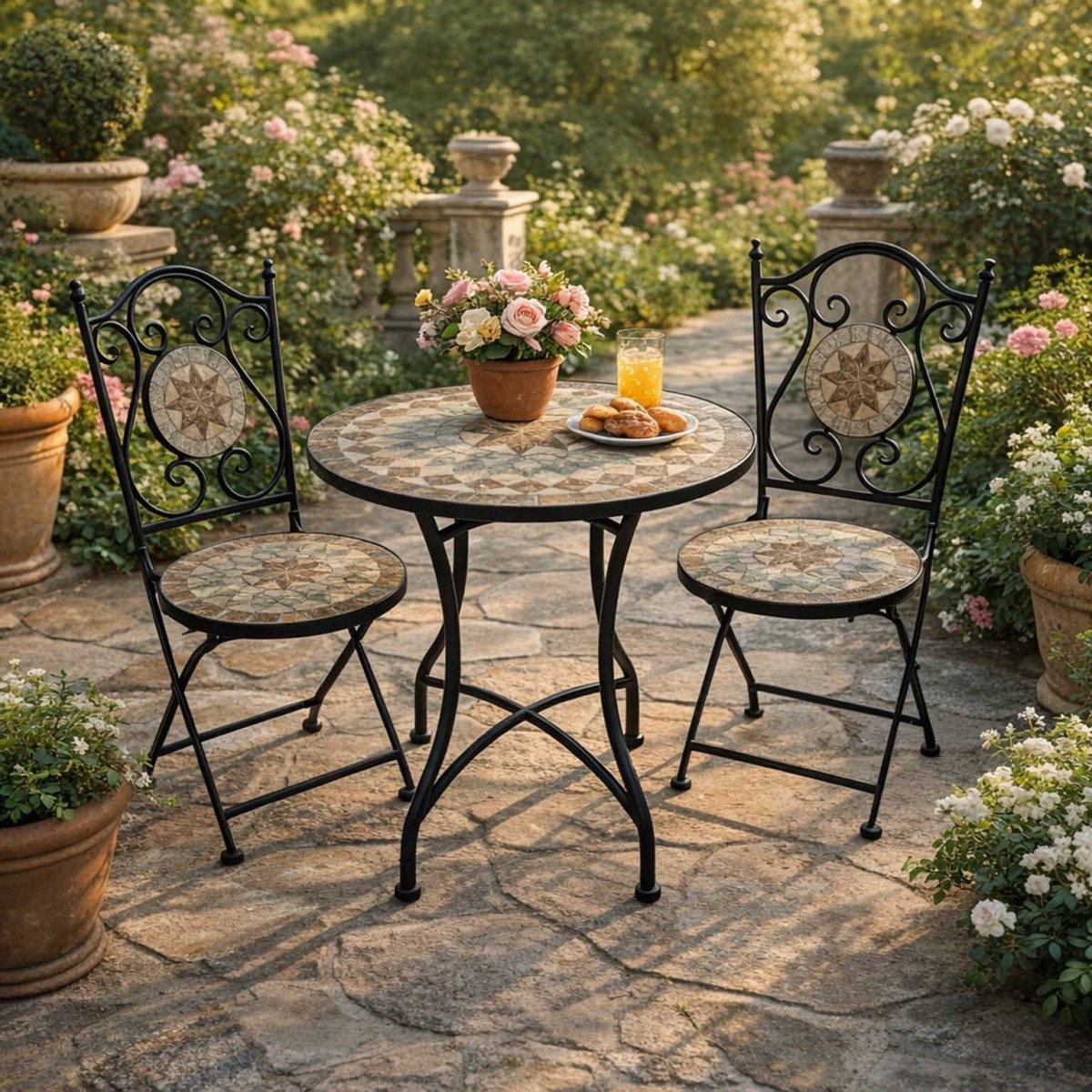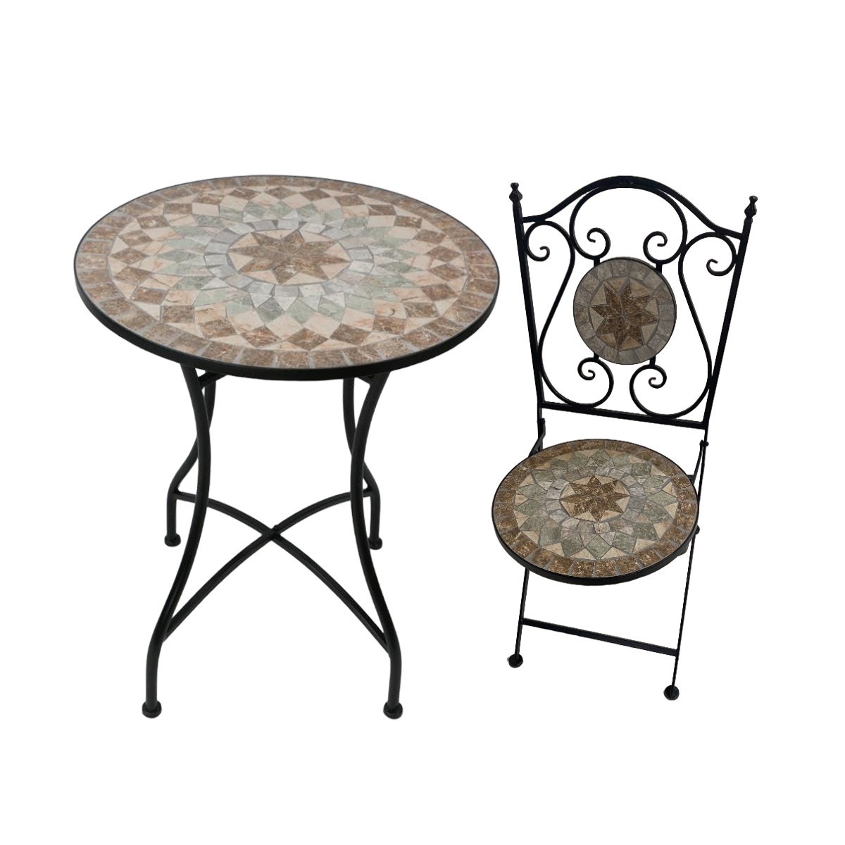 El material principal del conjunto es metal, lo que contribuye a su robustez y resistencia a las inclemencias del tiempo. Este material asegura que el conjunto mantenga su aspecto y funcionalidad a lo largo del tiempo, incluso en condiciones exteriores. El acabado de mosaico no solo es estético, sino que también es fácil de limpiar, permitiendo mantener el conjunto en óptimas condiciones.