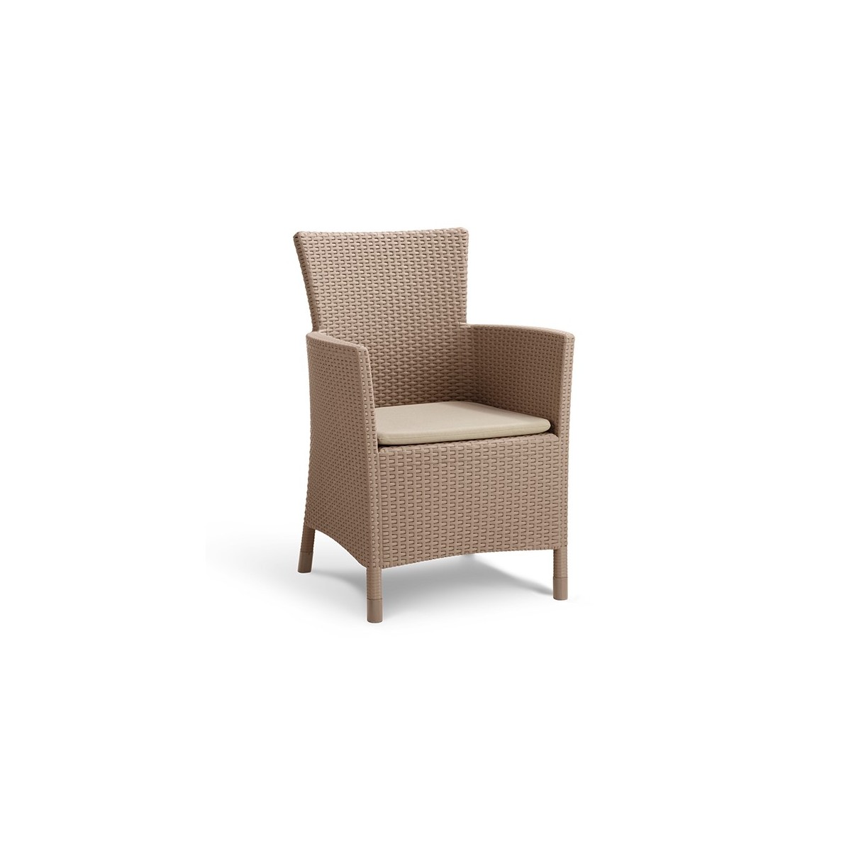 Visualmente, el Sillón YOWA taupe destaca por su tejido trenzado que simula el ratán natural, proporcionando un acabado atractivo y duradero. Su estructura es robusta, con un respaldo alto que ofrece un soporte cómodo, y brazos amplios que invitan a relajarse. El cojín de asiento, en un tono más claro, añade un contraste sutil y está diseñado para brindar comodidad durante largas jornadas al aire libre.
