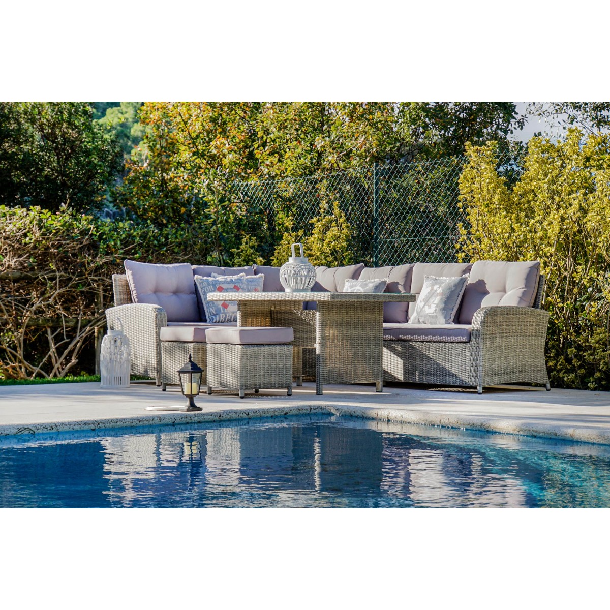 Set sofá + 2 taburetes + mesa, con estructura de ratan sintético, ideal para exteriores. Diseño elegante y resistente a las inclemencias del tiempo, perfecto para disfrutar de tu terraza o jardín.