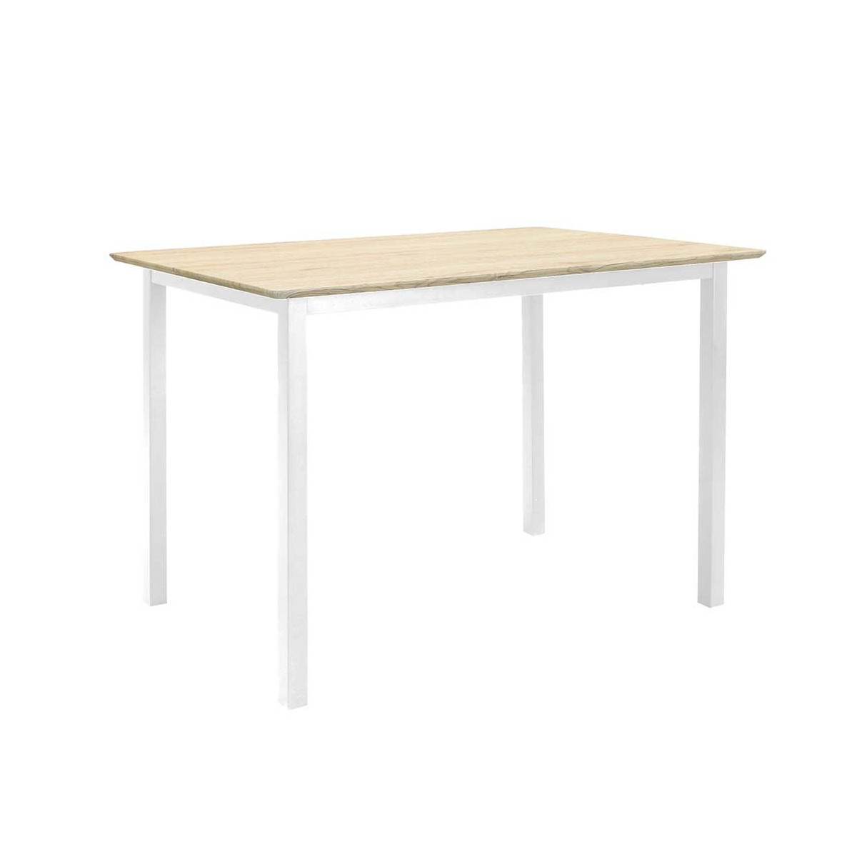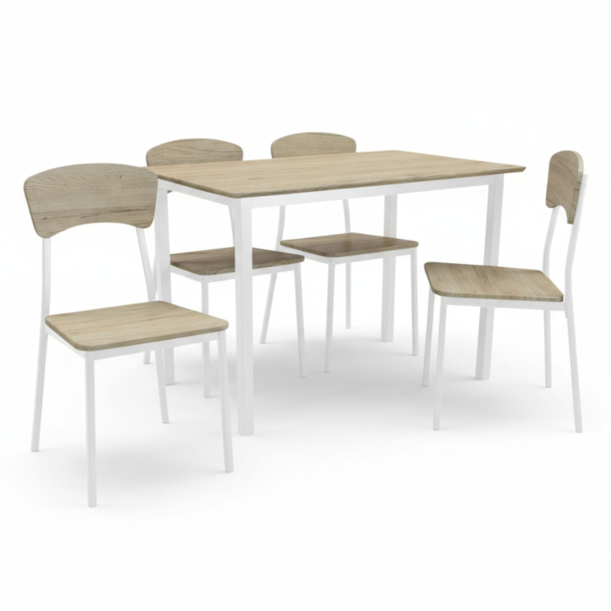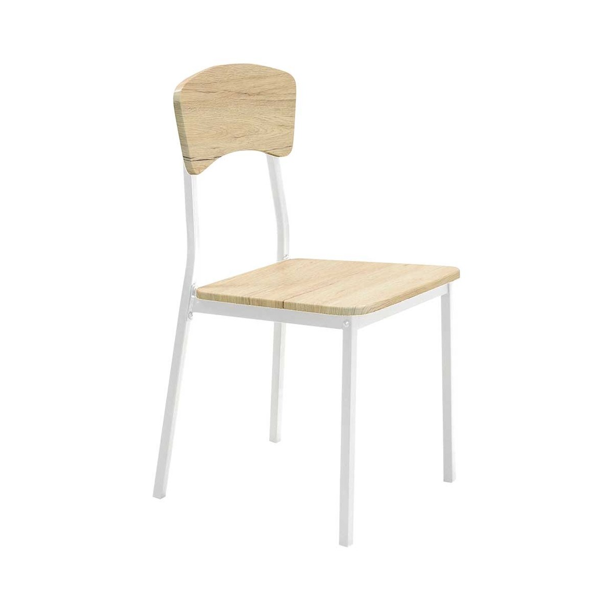Visualmente, el conjunto destaca por su contraste de colores, donde las patas de metal en blanco ofrecen un apoyo estable y moderno, mientras que la superficie de la mesa y los asientos de las sillas presentan un acabado en color cambrian, que imita la textura de la madera. Esta combinación no solo es estéticamente agradable, sino que también añade un aire contemporáneo a cualquier ambiente. Las líneas limpias y el diseño minimalista lo convierten en una opción versátil que se adapta a diferentes estilos de decoración.