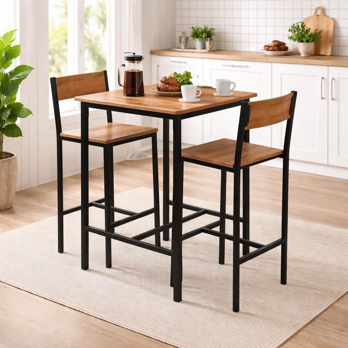 Visualmente, el conjunto presenta una mesa cuadrada de 60 cm de lado y 87 cm de altura, perfecta para disfrutar de comidas informales o compartir momentos con amigos. Los taburetes, con un diseño a juego, cuentan con unas dimensiones de 41.5 cm de ancho, 39.5 cm de fondo y 95.5 cm de altura, brindando una estética armoniosa. Los acabados en madera MDF aportan un toque cálido, mientras que las estructuras metálicas en negro aportan robustez y un toque industrial.