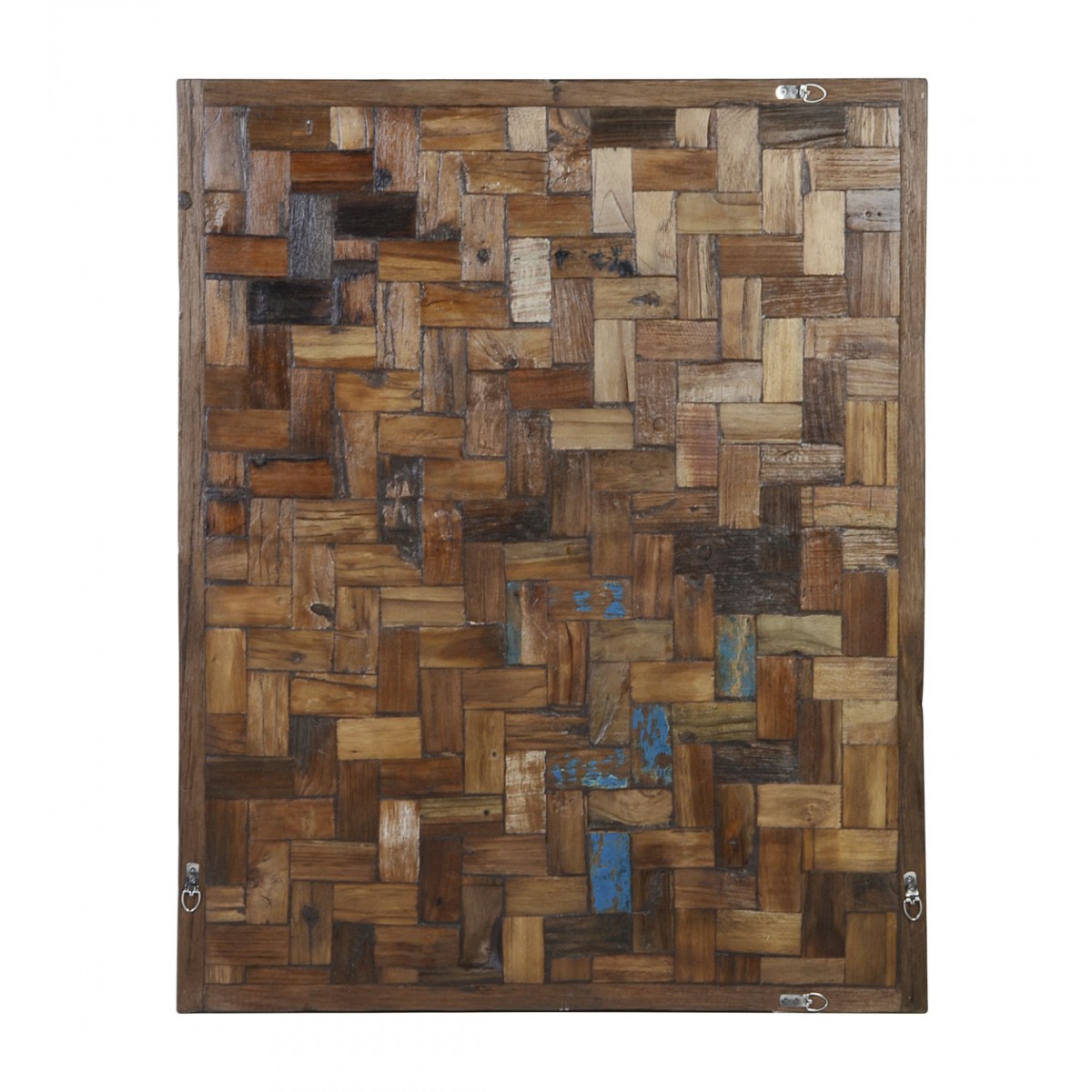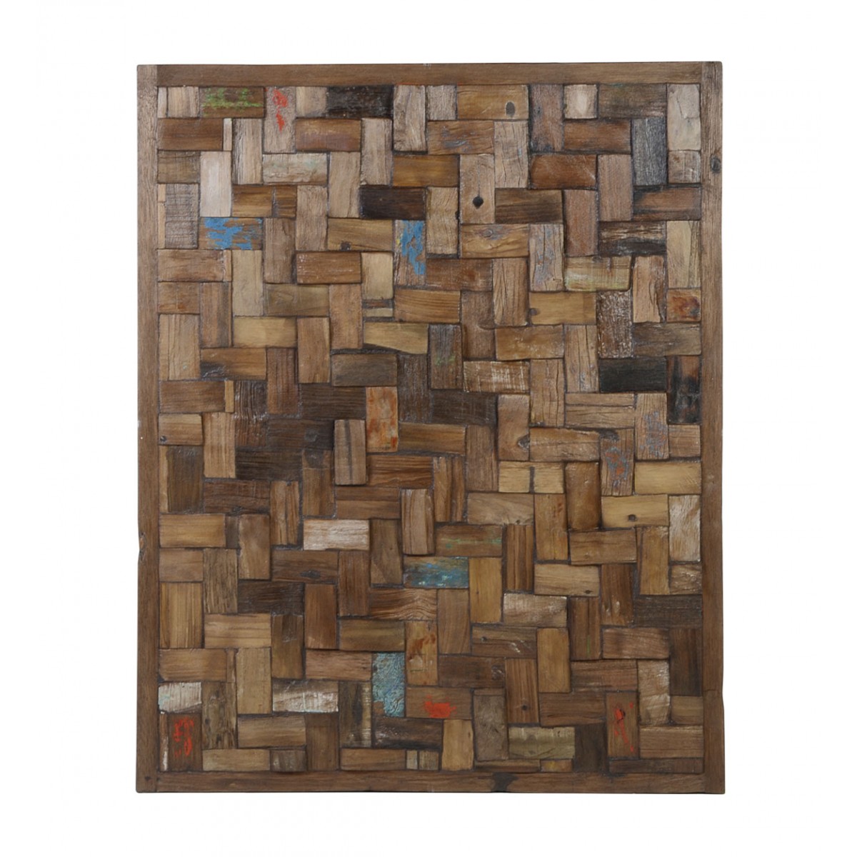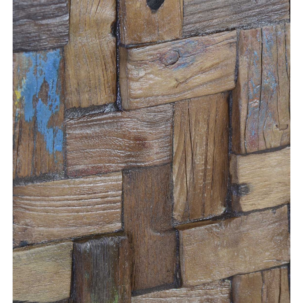 Visualmente, el Panel MULTI trozos presenta una composición de pequeñas piezas de madera dispuestas en un patrón entrelazado que crea una textura rica y variada. Las diferentes tonalidades de la madera, que van desde el marrón claro hasta el más oscuro, junto con algunas pinceladas de color azul y rojo, aportan un carácter rústico y acogedor. Cada panel es un producto único, lo que significa que puede presentar variaciones en el color y la textura, haciendo que cada pieza sea verdaderamente especial.