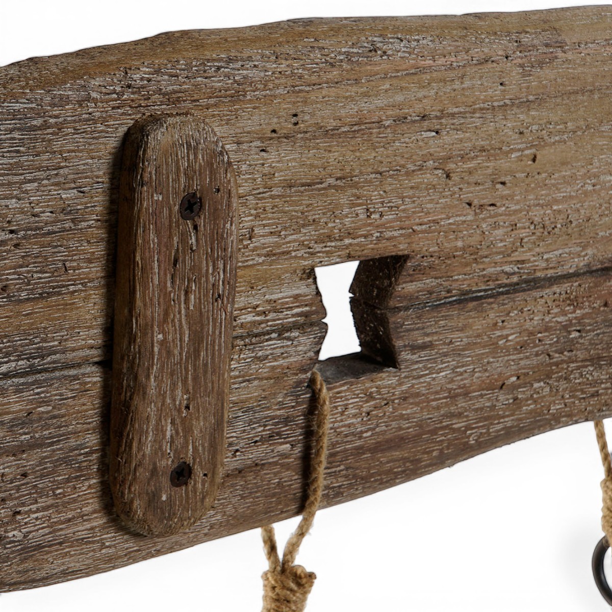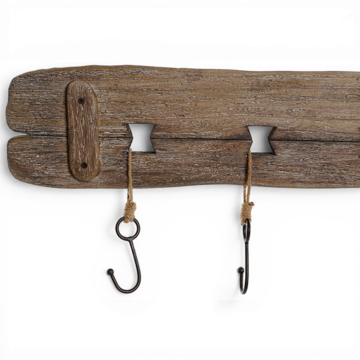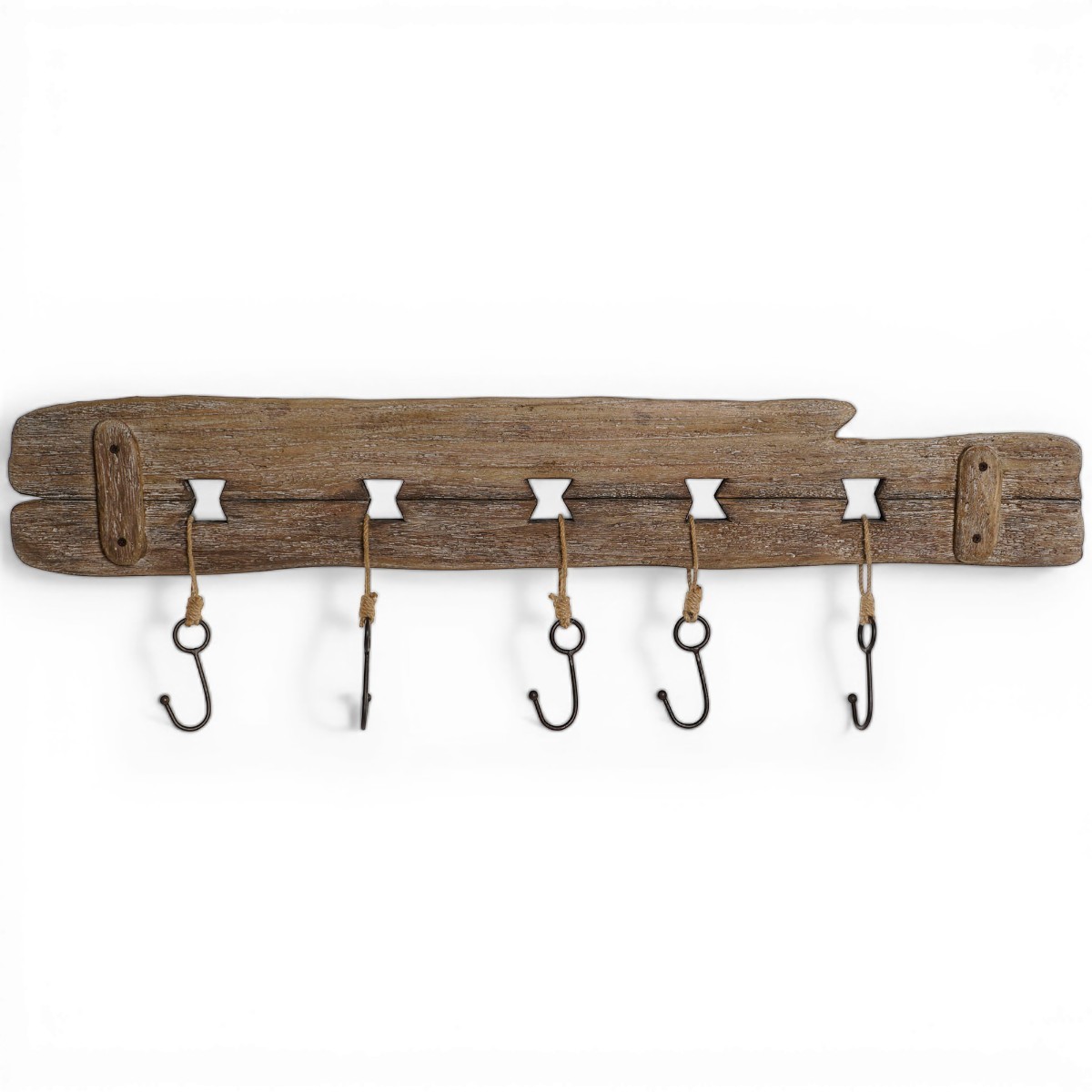 Visualmente, el perchero destaca por su tonalidad natural, que resalta la textura y las imperfecciones del paulownia, aportando un encanto rústico. Los ganchos, elaborados en metal, contrastan elegantemente con la madera, ofreciendo un aspecto industrial que complementa su diseño. Los cinco ganchos son ideales para colgar abrigos, bufandas, o accesorios, garantizando funcionalidad sin sacrificar el estilo. La disposición de los ganchos, a diferentes alturas, permite un uso óptimo del espacio, facilitando el acceso a las prendas.