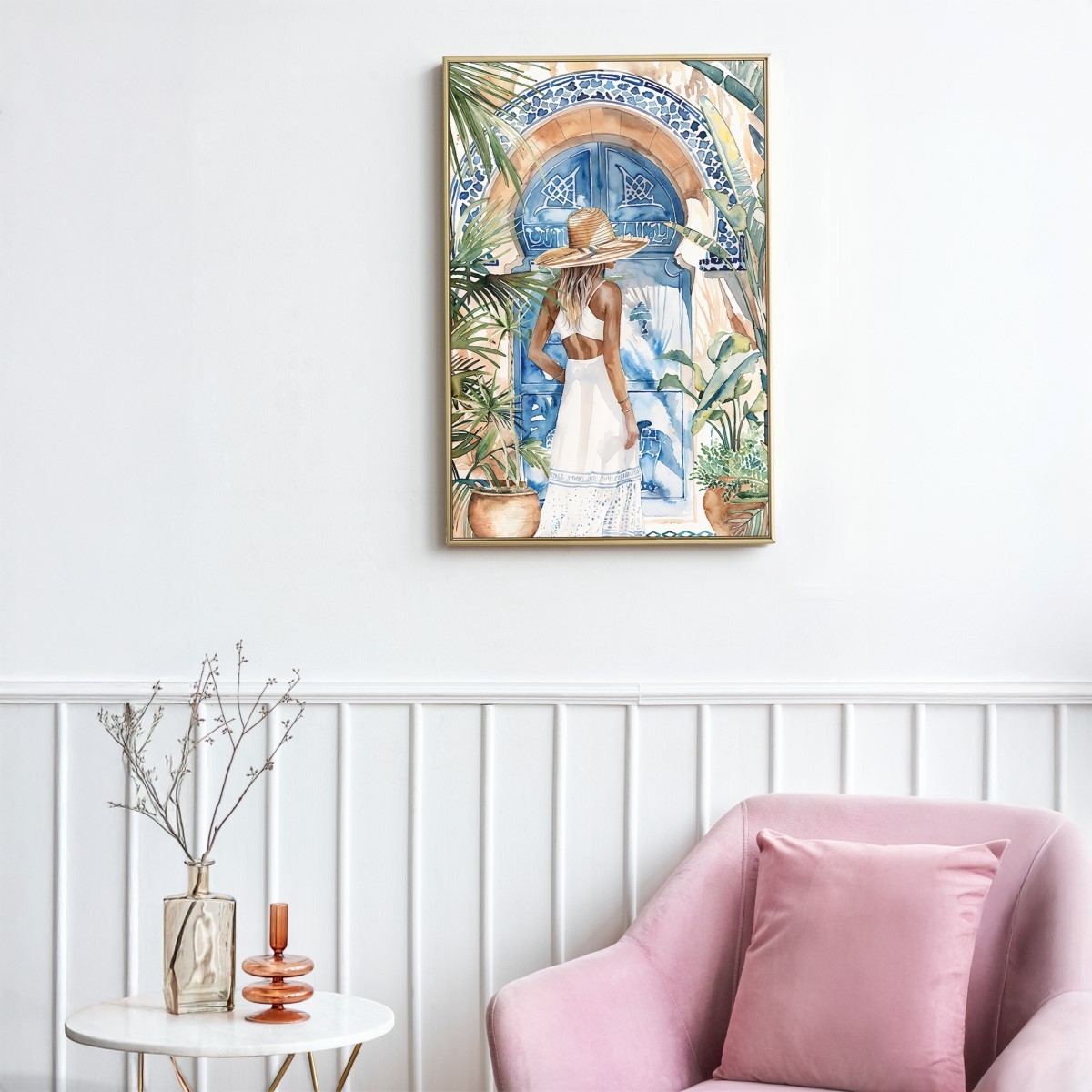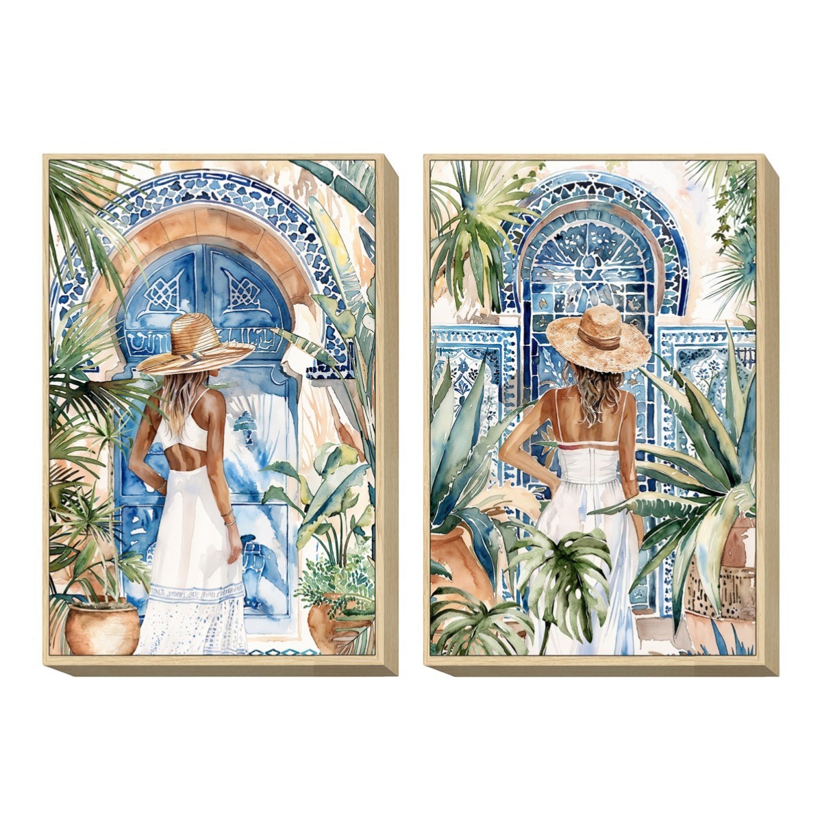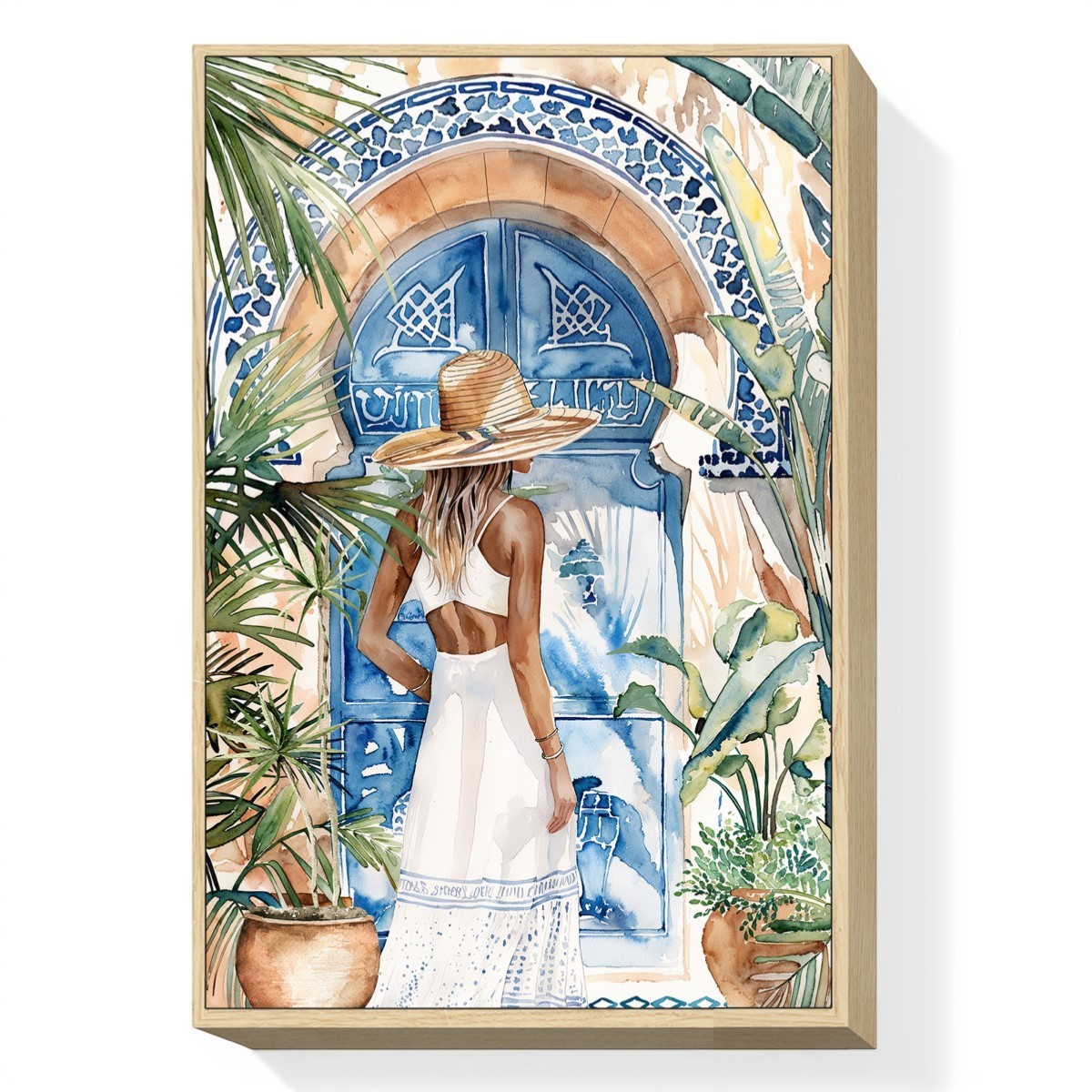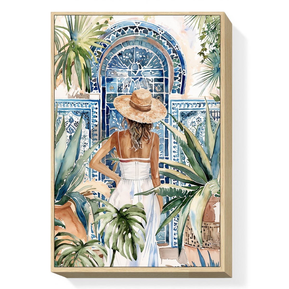 Visualmente, el cuadro acapara la atención con sus vibrantes colores acuáticos, que varían desde azules profundos hasta tonos cálidos de beige y verde. La delicadeza de la pintura se complementa con un acabado suave, realzando la belleza de la escena. El uso de plantas como el aloe y la monstera añade un toque de frescura y naturalidad, creando un contraste perfecto con la figura de la mujer vestida con un elegante vestido blanco. Este cuadro no solo es una obra de arte, sino también un elemento que invita a la paz y la serenidad en cualquier entorno.