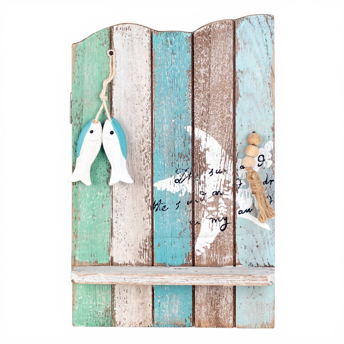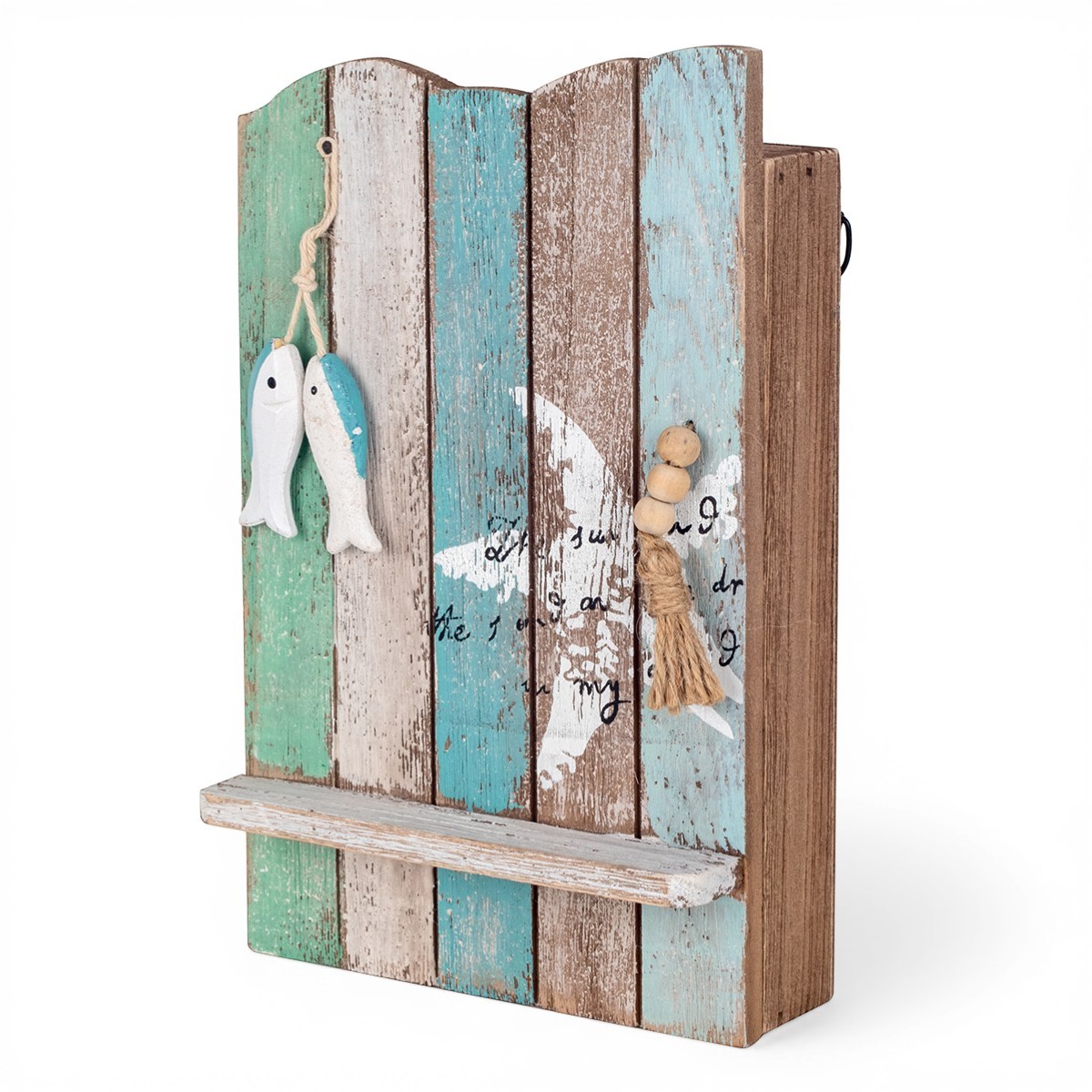 Visualmente, el Cuelgallaves PAU destaca por sus colores vibrantes y su acabado desgastado que simula la madera envejecida. Las tonalidades en verde, azul y marrón se combinan armónicamente, evocando la frescura del mar. Además, la presencia de detalles como los peces de cerámica y las letras impresas añaden un encanto especial al diseño. Este cuelgallaves es perfecto para aquellos que buscan un toque de diversión y originalidad en su hogar.