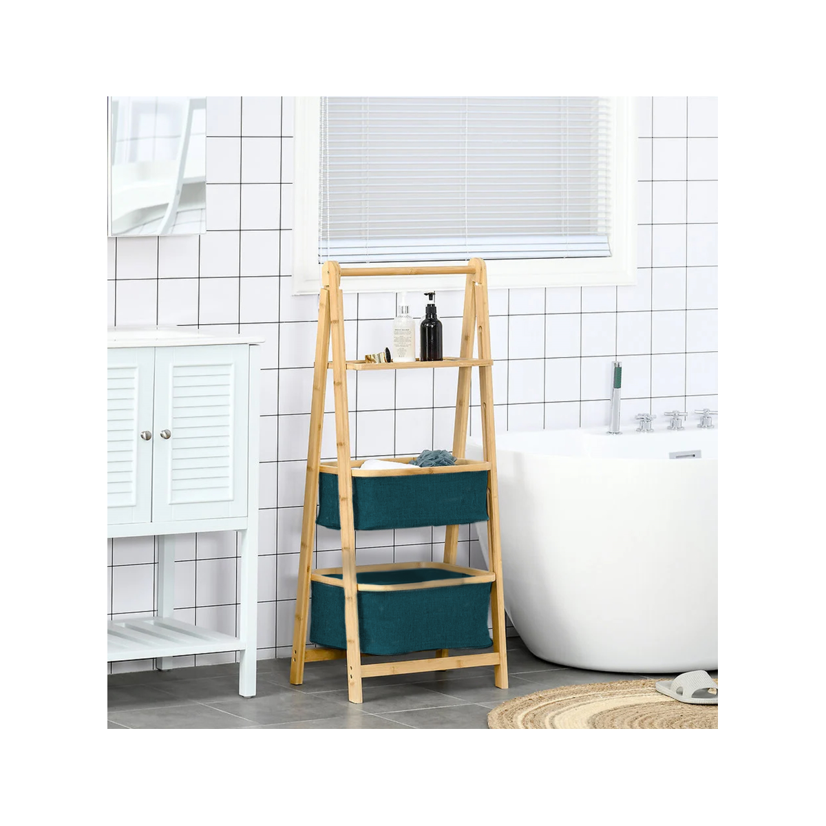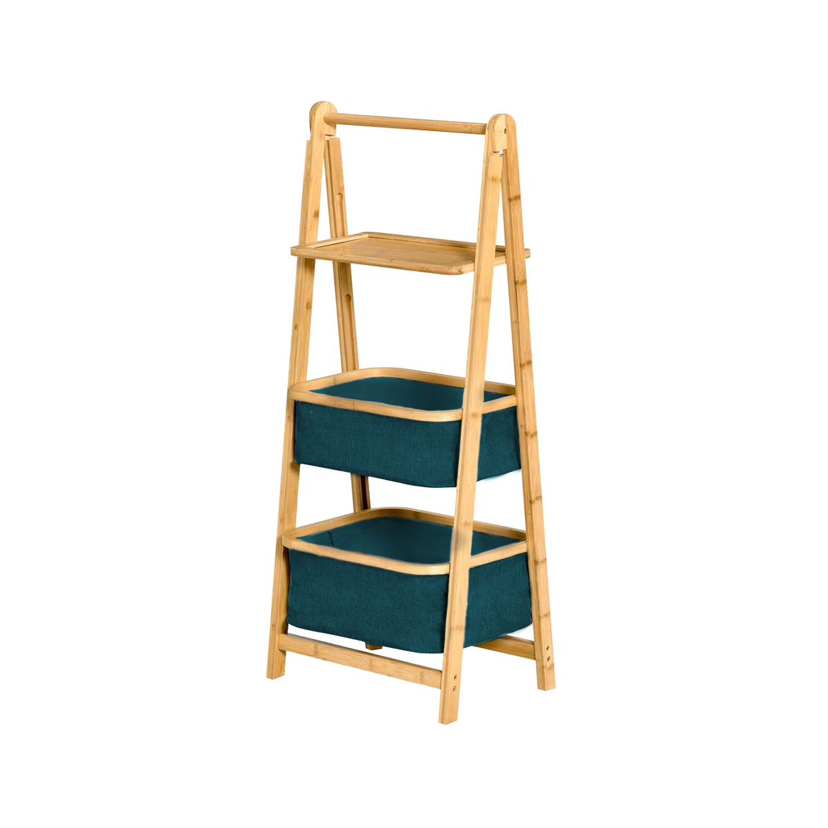 En términos de características técnicas, la Estantería BAMBU 24 no solo es visualmente atractiva, sino también altamente funcional. Su estructura robusta soporta hasta 25 kg, lo que la hace apta para almacenar desde productos de baño hasta libros o decoraciones. Las cestas de tejido en un elegante tono azul oscuro contrastan maravillosamente con la madera clara, añadiendo un elemento de color que realza su apariencia general. El diseño abierto de las estanterías permite un fácil acceso a los objetos almacenados, mientras que las cestas aportan un toque de organización y estilo.