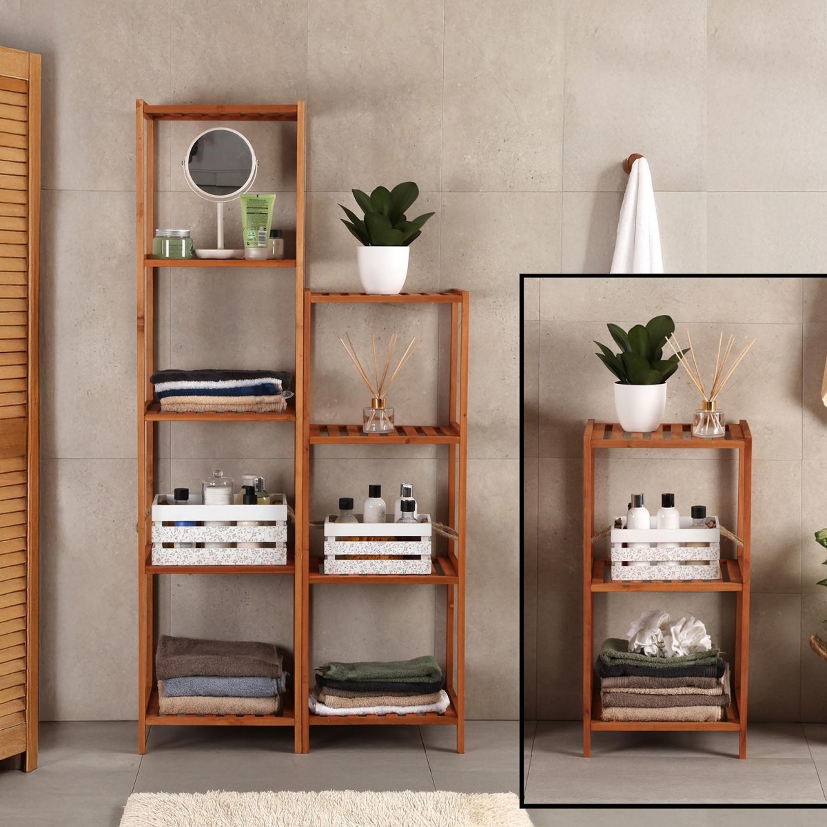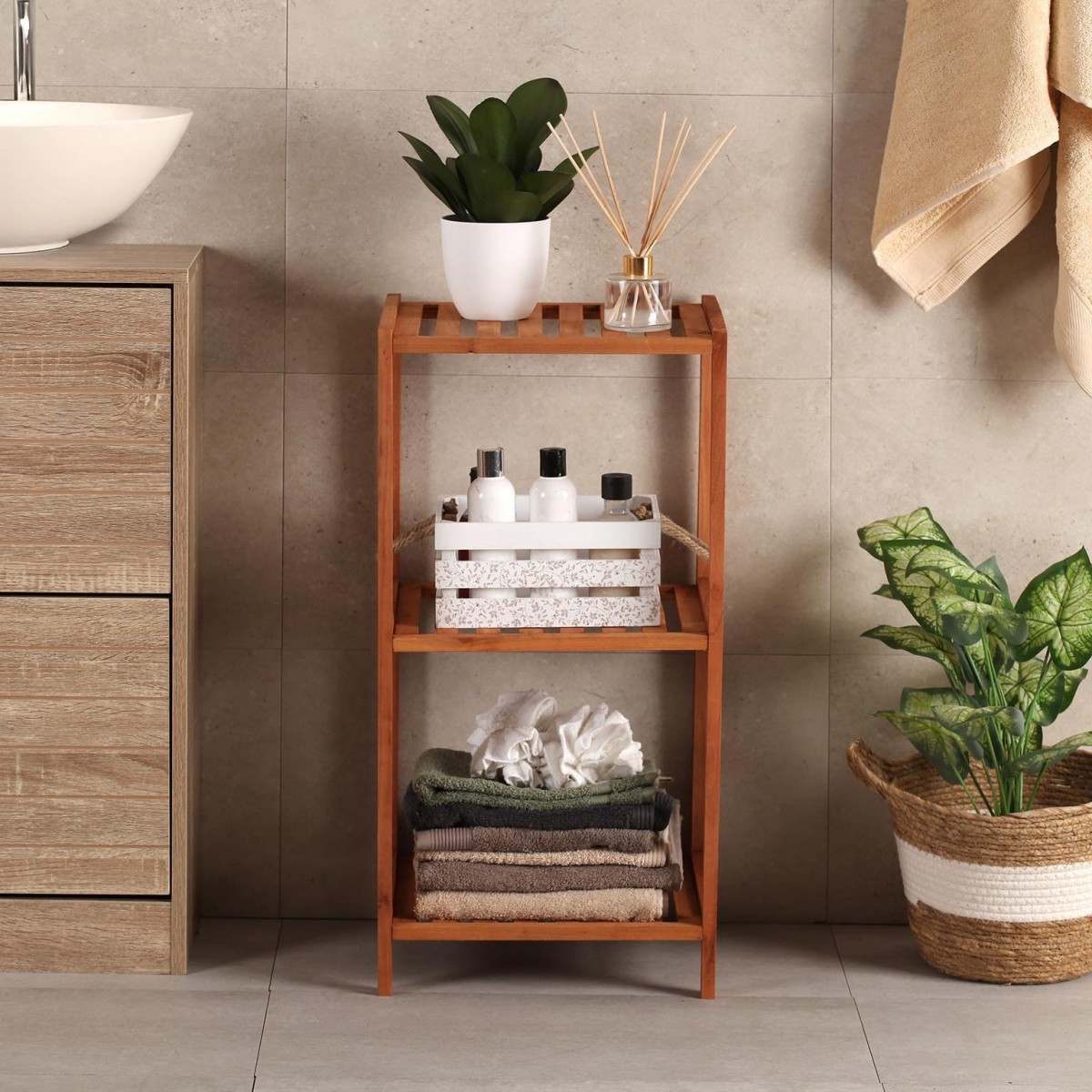 La Estantería ZION 3 baldas es una solución práctica y estilizada para el almacenamiento en cualquier espacio de tu hogar. Con un diseño moderno y funcional, esta estantería se integra perfectamente en ambientes como el baño, la cocina o el salón. Su estructura de madera, que resalta por su acabado en un cálido tono marrón, aporta un toque natural y acogedor a la decoración. Las tres baldas ofrecen un amplio espacio para organizar tus objetos, desde toallas y productos de baño hasta libros y decoraciones.
