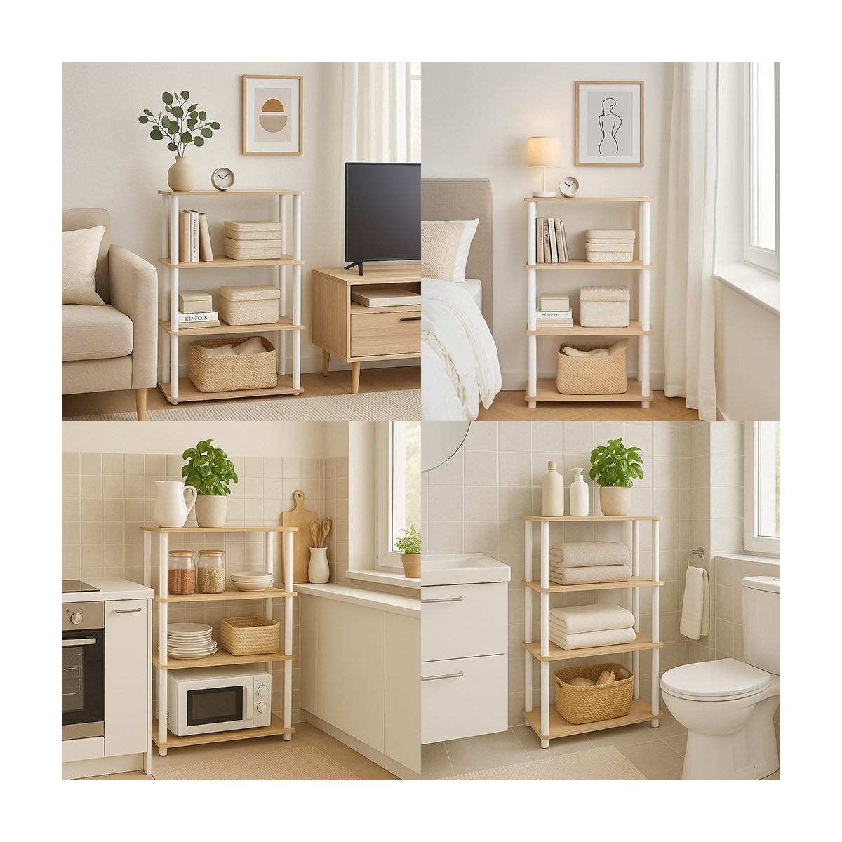 La Estantería ALTURA 4b es una solución elegante y funcional para cualquier espacio en tu hogar. Con un diseño minimalista y moderno, esta estantería se adapta perfectamente a diversas estancias, desde el salón hasta el baño. Su estructura combina un acabado en madera de color claro con detalles en plástico blanco, creando un contraste visual atractivo que complementa cualquier decoración. Con unas dimensiones de 113 cm de alto, 29.5 cm de ancho y 60 cm de largo, es ideal para maximizar el almacenamiento sin ocupar demasiado espacio.