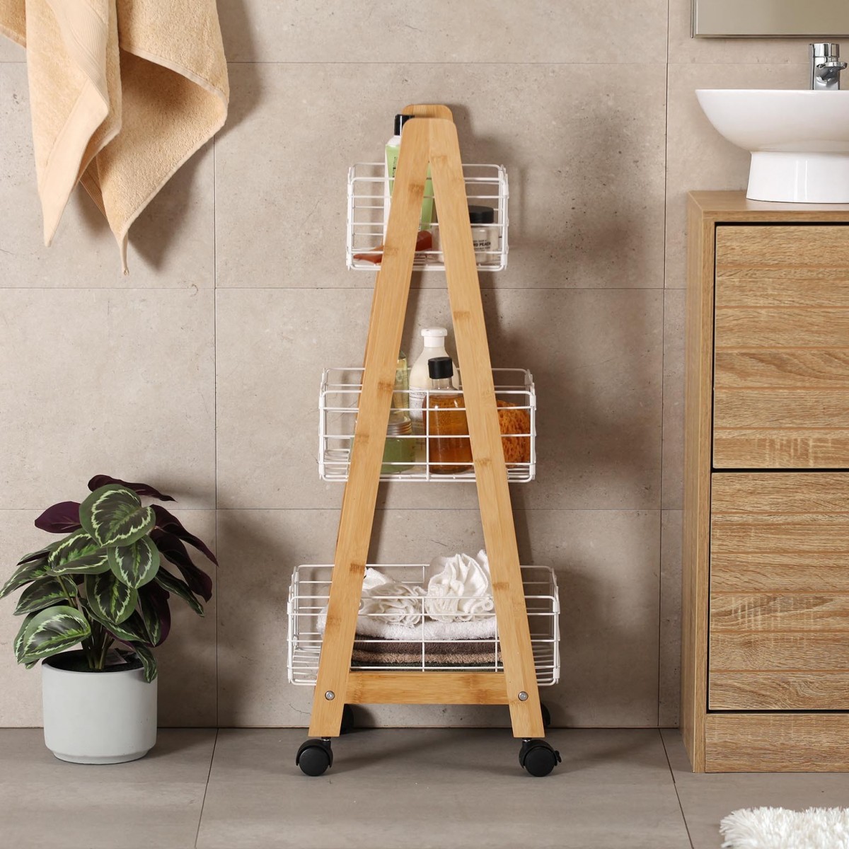Visualmente, la estantería destaca por su forma en A, que proporciona estabilidad y un toque contemporáneo. Las tres cestas metálicas blancas son perfectas para almacenar artículos de uso diario, y su acabado liso facilita la limpieza. Los detalles en bambú aportan un contraste atractivo que complementa la estética general del mueble. Las dimensiones de la estantería, con un alto de 86 cm, un ancho de 26 cm y un largo de 35 cm, la hacen adecuada para espacios reducidos, garantizando que no ocupe mucho espacio mientras ofrece una gran capacidad de almacenamiento.