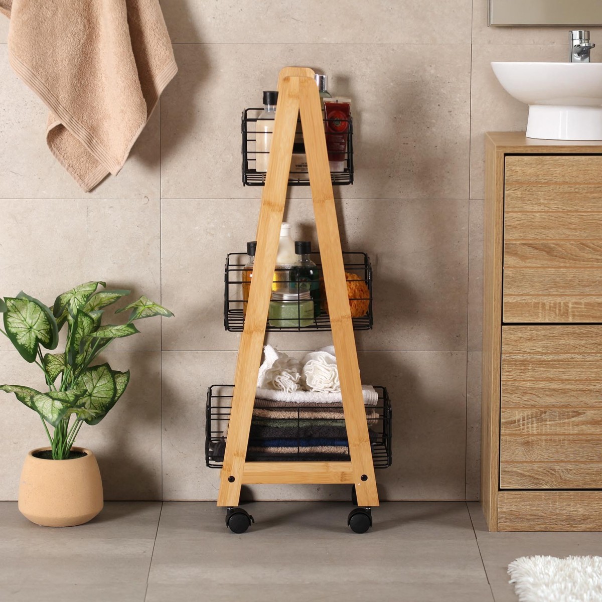 Además, la combinación de materiales de bambú y metal asegura una durabilidad que soporta el uso diario. Esta estantería es ideal para almacenar utensilios de cocina, toallas en el baño o incluso como un carrito de servicio en reuniones familiares. Su construcción sólida y su diseño atractivo la convierten en un mueble imprescindible.