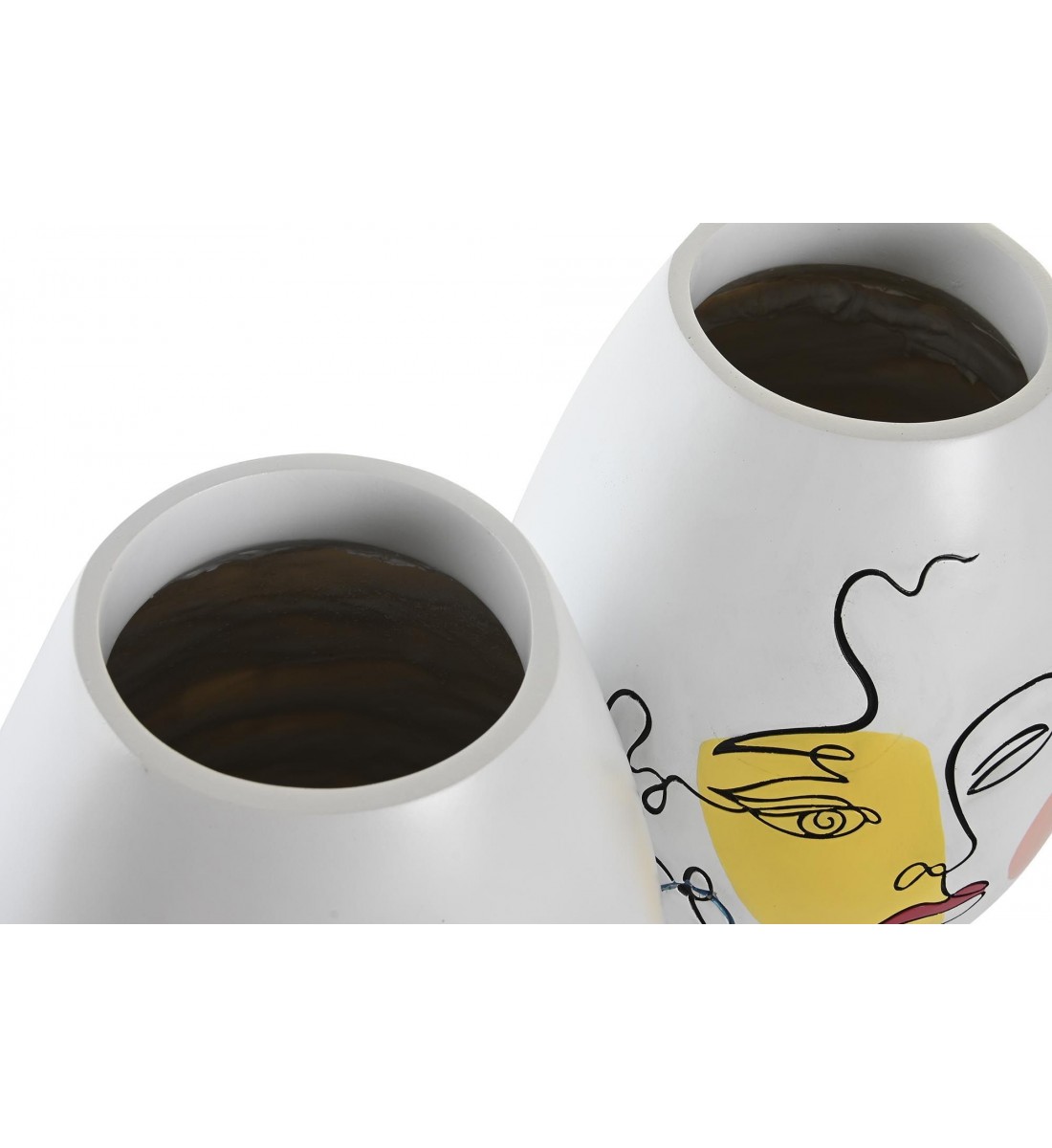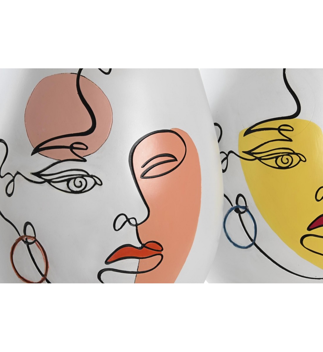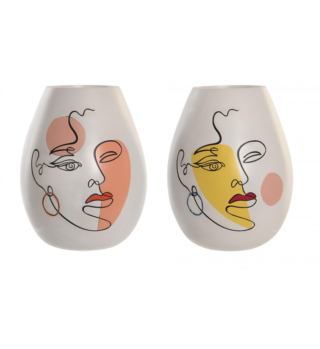 Fabricado en cerámica de alta calidad, el Jarrón JED 227 destaca por su acabado mate que ofrece un tacto agradable y una apariencia moderna. Los colores predominantes son el blanco, que sirve como base, junto a tonos coral, amarillo y rosa que se entrelazan en un diseño abstracto que evoca la figura humana. Los contornos en negro añaden un contraste atractivo, haciendo que cada jarrón sea una obra de arte visual.