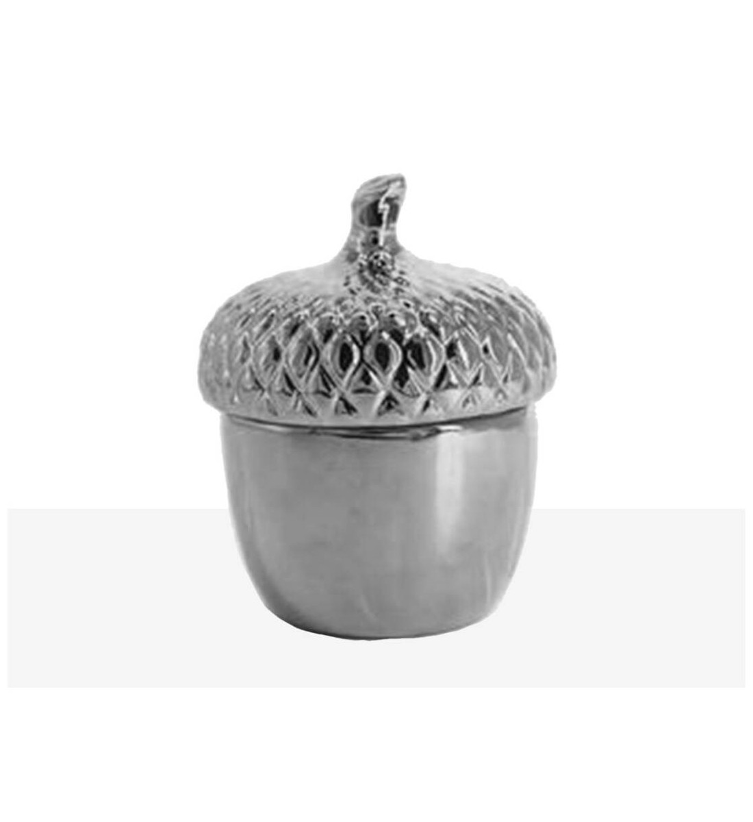 Descubre la elegante Caja BELLOTA plateada, una pieza excepcional que combina funcionalidad y estilo. Fabricada en cerámica, su acabado plateado brillante aporta un toque moderno y sofisticado a cualquier espacio. La forma de bellota, con su tapa decorativa que simula la parte superior de este fruto, añade un elemento de diseño único y encantador. Ideal para decorar mesas, estanterías o cualquier rincón de tu hogar, esta caja no solo es un objeto decorativo, sino también una solución práctica para el almacenamiento.