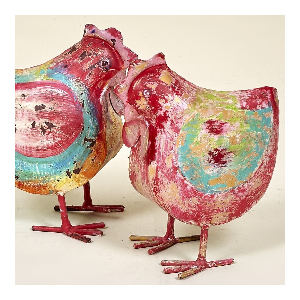 La figura GALLINA 820 está fabricada con materiales de alta calidad, lo que garantiza su durabilidad y resistencia. Su diseño incluye detalles pintados a mano que reflejan un estilo único y artesanal. Los tonos turquesa y fresa se combinan armoniosamente, mientras que las imperfecciones intencionadas en la pintura añaden carácter y autenticidad a la pieza. Las patas metálicas y la textura del cuerpo proporcionan un contraste interesante, haciendo que esta figura sea tanto atractiva como funcional.