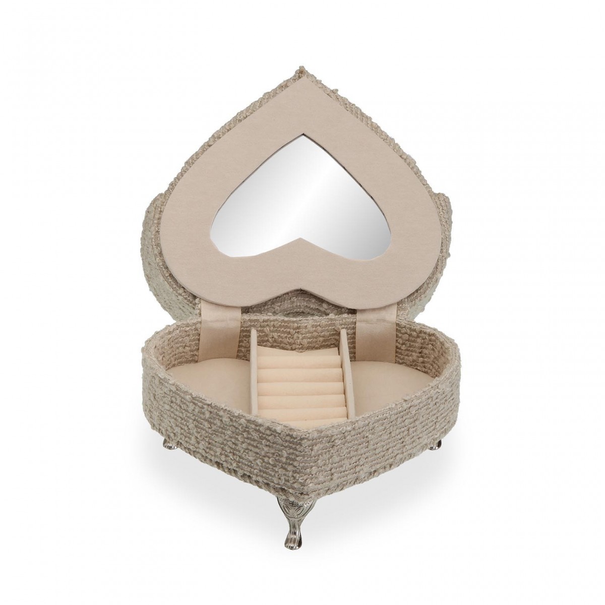 Visualmente, el Joyero SOFA gris claro destaca por su forma de corazón, lo que añade un aire romántico y acogedor. La estructura está confeccionada en una mezcla de poliéster y madera MDF, proporcionando tanto resistencia como un aspecto elegante. Los dos cojines en forma de corazón que adornan el respaldo son un detalle encantador que refuerza su diseño lujoso. Las patas metálicas, en un acabado brillante, complementan la estética general y aportan estabilidad.