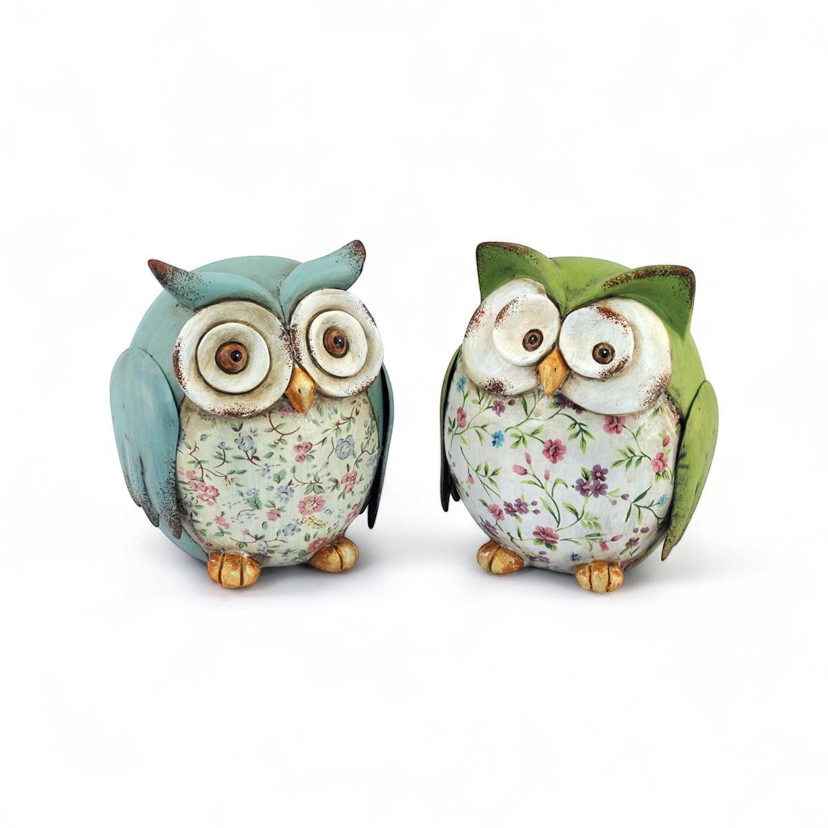 Visualmente, el Set 2 BUHOS destaca por sus colores vibrantes. Uno de los búhos es de un encantador tono azul, mientras que el otro presenta un refrescante verde. Ambos cuentan con detalles florales en el cuerpo, que aportan un contraste encantador con sus tonalidades. Los ojos grandes y expresivos, así como los picos en tonos marrones, añaden un carácter juguetón a estas figuras. La combinación de colores y el diseño floral hacen que sean un excelente complemento para espacios tanto modernos como rústicos.