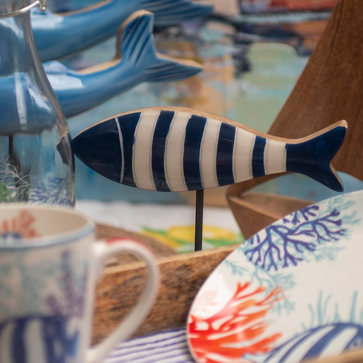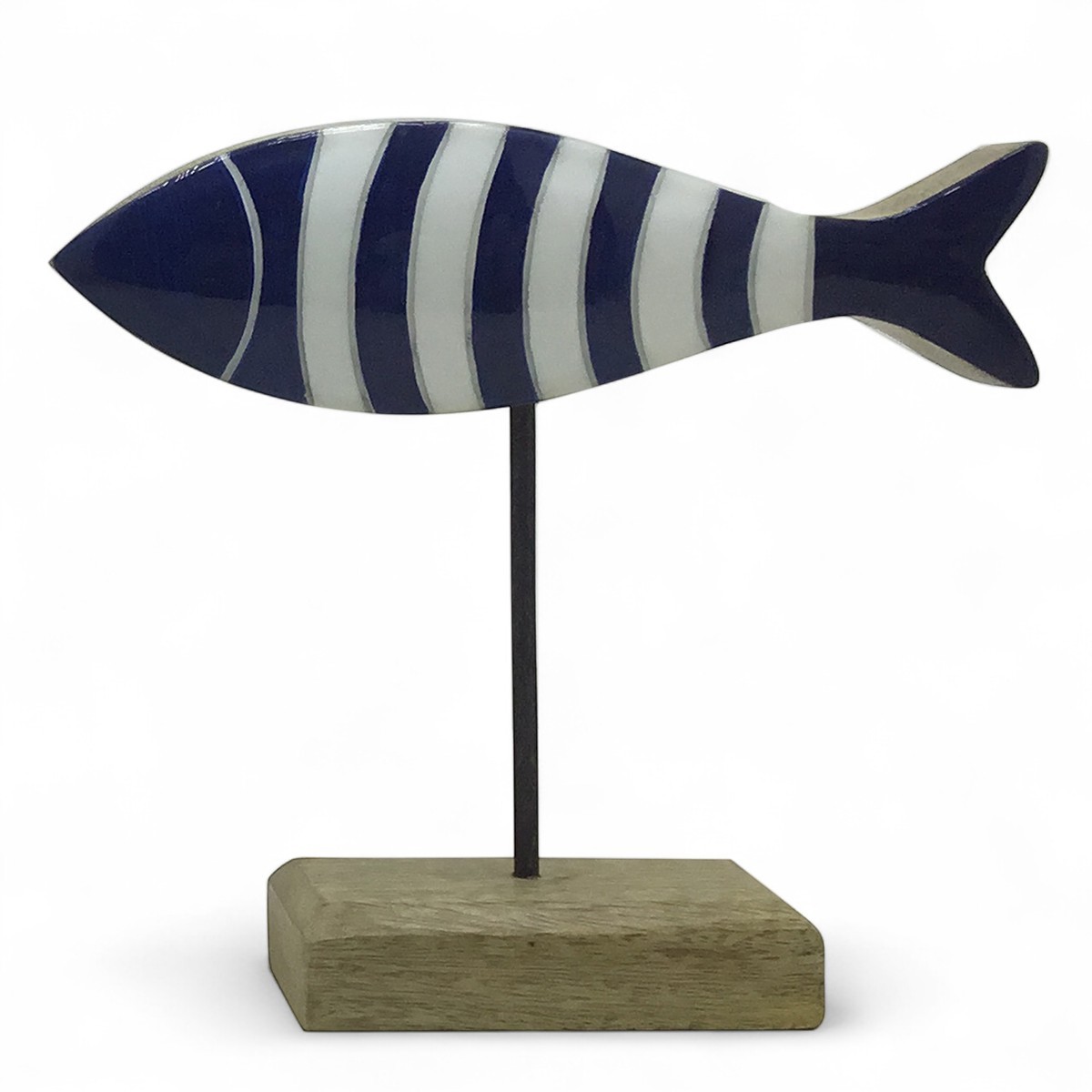 Visualmente, la figura presenta un acabado brillante que resalta las líneas curvas y los detalles del pez. Las franjas alternas en azul y blanco proporcionan un efecto dinámico y moderno, ideal para decoraciones marítimas o costeras. Su base sólida de madera complementa el diseño, asegurando estabilidad y un soporte elegante para esta pieza única. Sin duda, es un elemento que puede integrarse perfectamente en estanterías, mesas o rincones especiales de su hogar.