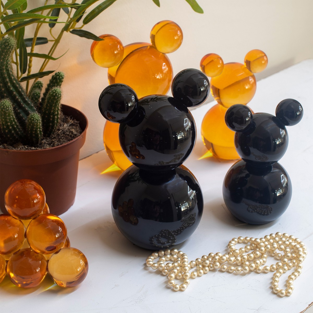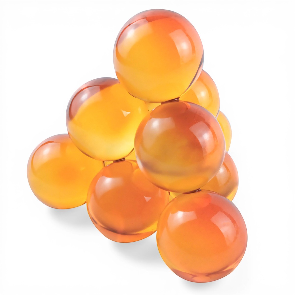Visualmente, la figura se presenta en un hermoso tono ámbar, que va de un color más oscuro en la parte superior a un matiz más claro en la base. Este degradado de color resalta la transparencia y el brillo del vidrio, generando un efecto luminoso que varía según la incidencia de la luz. Las esferas están pulidas a la perfección, lo que les confiere un acabado suave y atractivo al tacto. Esta pieza se convierte en un elemento llamativo, perfecto para exhibir en estanterías, mesas o vitrinas.
