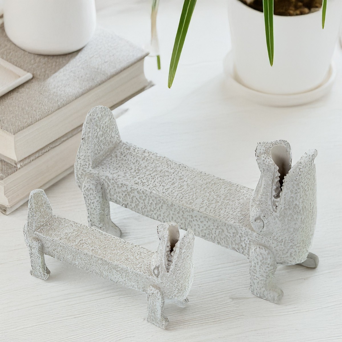 Con unas dimensiones de 30 cm de largo, 8 cm de ancho y 18 cm de alto, la figura COCODRILA es lo suficientemente versátil como para ser utilizada en estanterías, mesas o como parte de una colección de arte. Su color blanco puro permite que se integre armoniosamente en cualquier entorno, mientras que la textura rugosa proporciona un contraste visual interesante que atrae la atención. Este detalle, junto con la expresión juguetona de su diseño, hace que esta figura sea ideal para añadir un toque de diversión a su hogar.