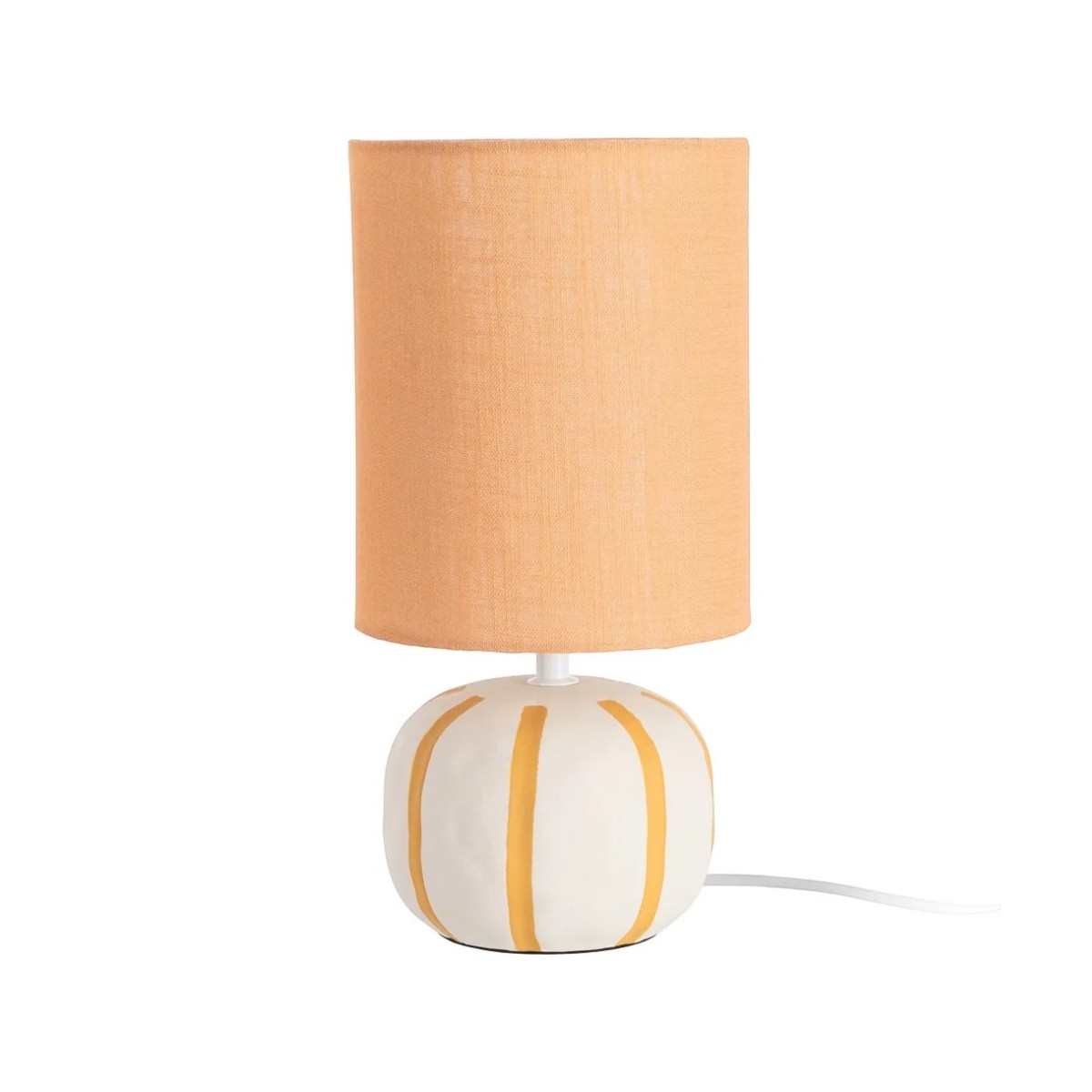 Visualmente, la lámpara presenta una base esférica de cerámica blanca, adornada con líneas naranjas que añaden un toque artístico y contemporáneo. La pantalla, confeccionada en un tejido suave, complementa la base a la perfección, creando un equilibrio entre texturas y colores. Con unas dimensiones de 43 cm de alto, 22.5 cm de ancho y 22.5 cm de largo, la Lámpara BASK es compacta, lo que la hace adecuada para mesas de noche, escritorios o incluso como una lámpara de acento en estanterías.