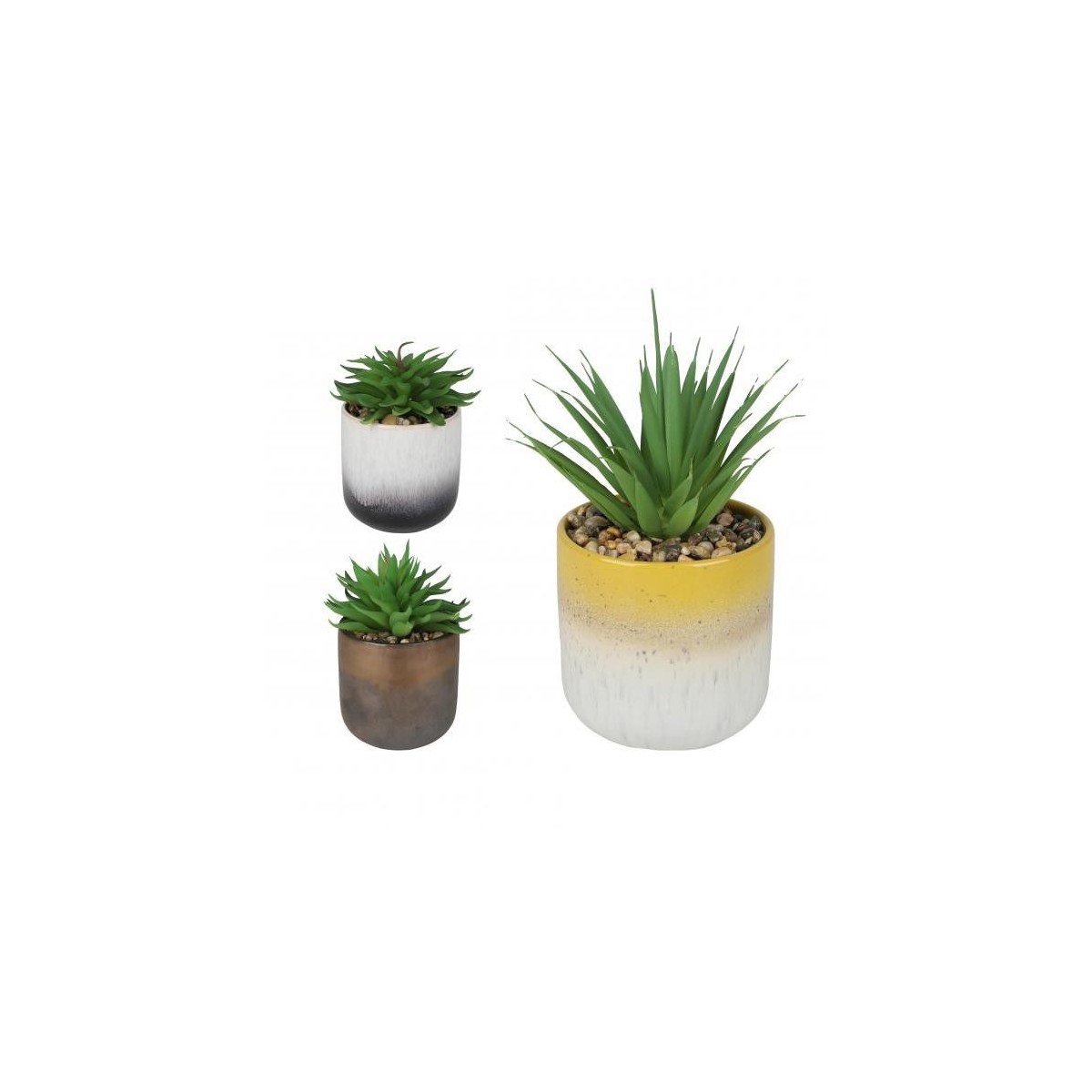 En cuanto a sus características técnicas, la Planta SUCULENTA 014 está compuesta por un material sintético que simula a la perfección la textura y el color de las suculentas naturales. Los maceteros que la acompañan poseen diferentes acabados: uno en un tono amarillo brillante, otro en un elegante gradiente que va de blanco a gris, y un tercero en un sutil color marrón. Cada macetero está adornado con grava decorativa en la parte superior, lo que añade un detalle extra que realza su aspecto general. Las medidas de la planta son ideales para adaptarse a cualquier rincón de su hogar u oficina.