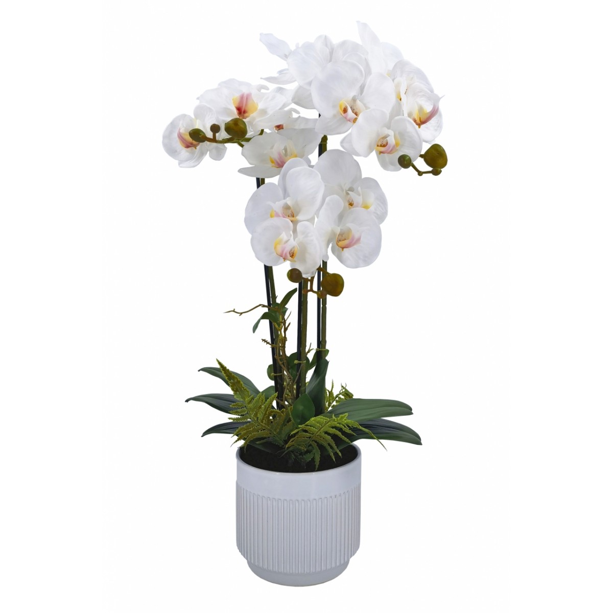 Entre las características técnicas de la Planta PHALENOPSIS 70 se encuentran sus tallos altos y robustos, que sostienen una abundancia de flores exuberantes. Fabricada con materiales de alta calidad, la maceta presenta un acabado liso y brillante en color blanco, con un diseño estriado que añade textura y profundidad. Las hojas en un verde intenso, junto con la vegetación adicional que acompaña a la orquídea, completan la composición, ofreciendo un aspecto natural y vibrante.