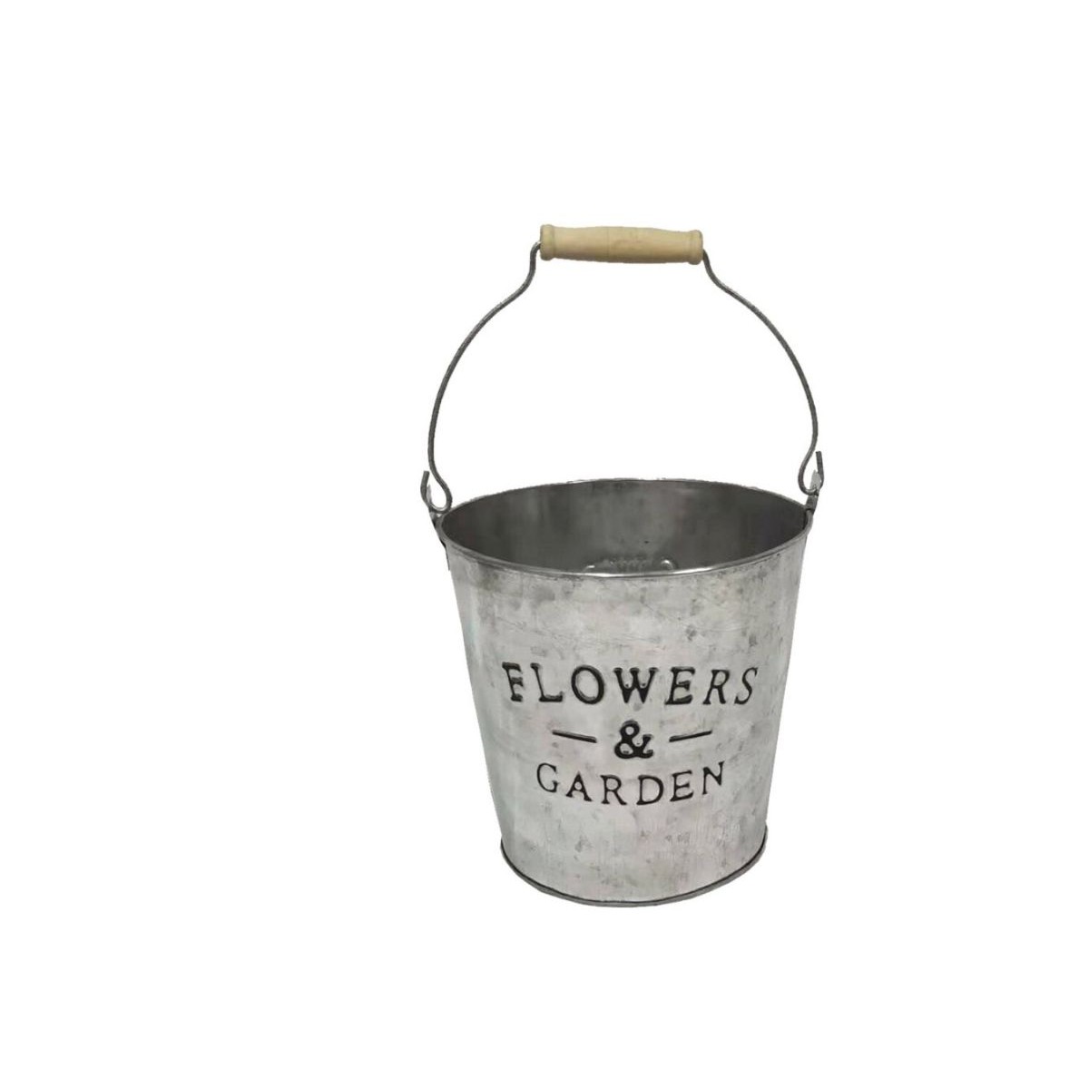 El Macetero D30 presenta un cuerpo robusto, con una superficie ligeramente texturizada que refleja la luz de manera encantadora. La parte frontal está decorada con la frase "FLOWERS & GARDEN", grabada en un estilo vintage que añade un carácter especial. Además, cuenta con un asa de metal, que permite un fácil transporte, complementada por un mango de madera que proporciona un agarre cómodo y seguro.