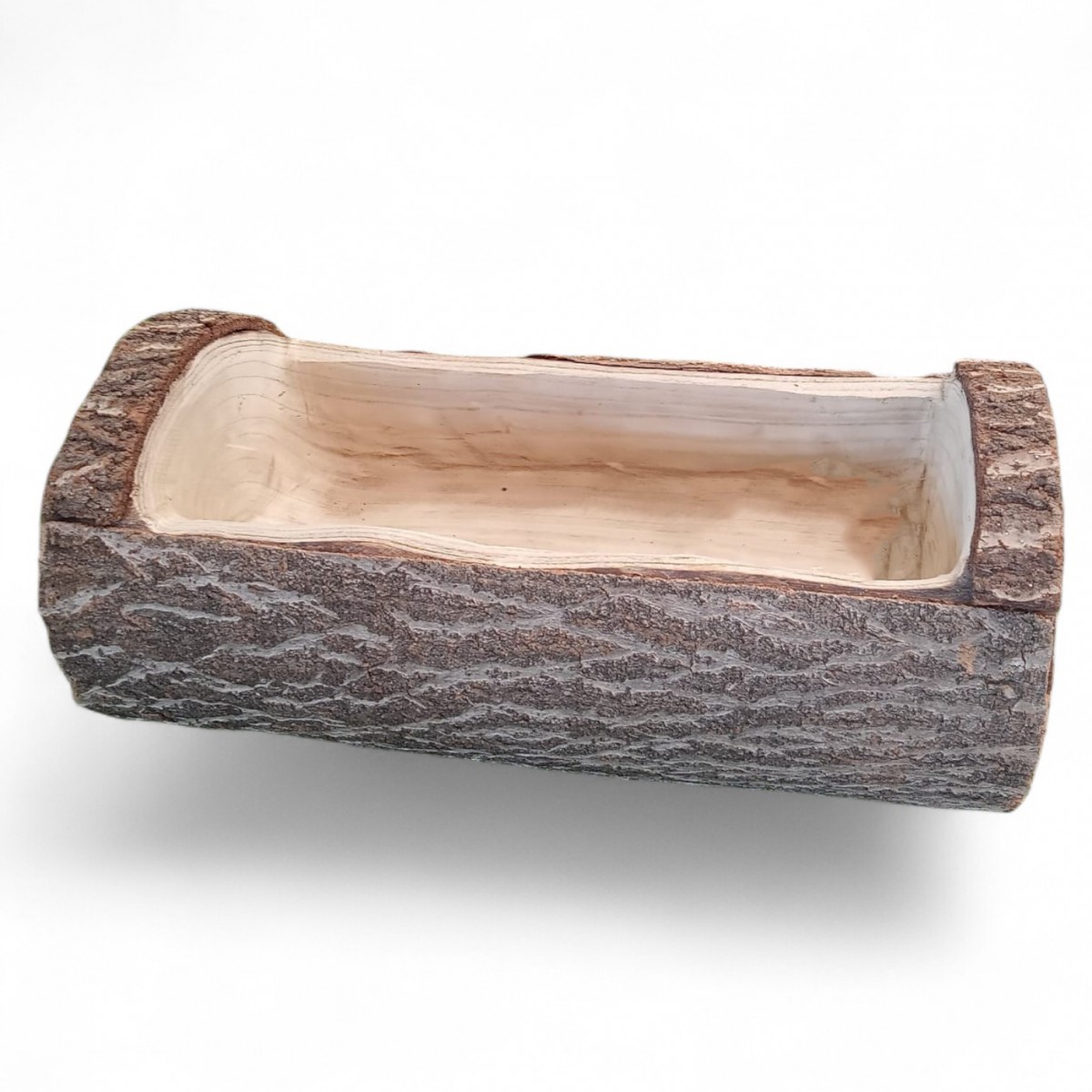 Visualmente, la jardinera presenta un acabado que combina tonos marrones cálidos, representando la corteza del árbol, con un interior más claro y suave que destaca la belleza natural de la madera. Las dimensiones de 48 cm de largo, junto con su forma rectangular, la hacen ideal para colocar en cualquier esquina o como elemento central en una mesa. Su diseño artesanal asegura que cada pieza sea única, añadiendo carácter a tu decoración.