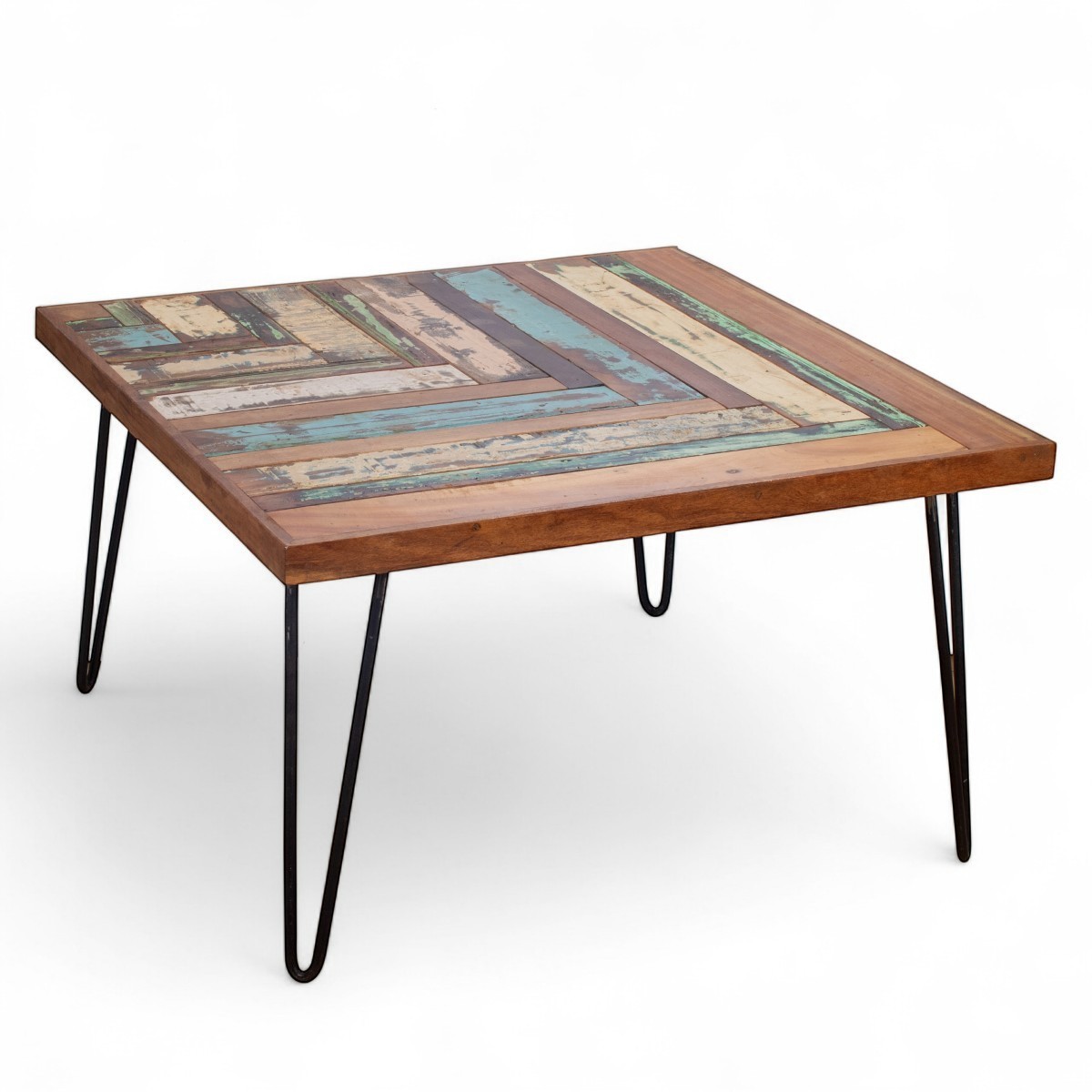 Visualmente, la mesa presenta una combinación de colores que varía entre tonos naturales y acabados desgastados, incluyendo azules y marrones que aportan un aire rústico y auténtico. La superficie de la mesa muestra un patrón de tablones dispuestos en un diseño de espiga, que resalta la diversidad de texturas y colores de la madera. Los bordes están acabados de forma pulida, mientras que las patas metálicas, de un elegante acabado negro, ofrecen estabilidad y un contraste atractivo con la calidez de la madera.