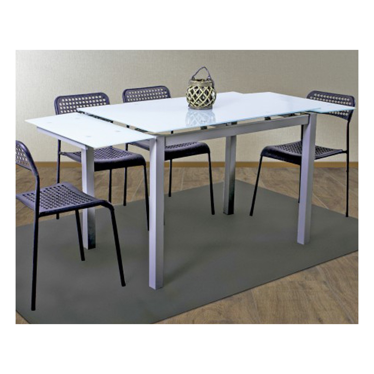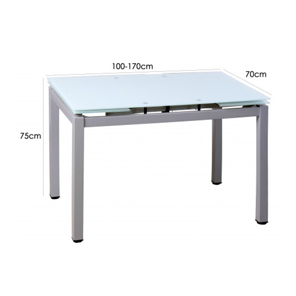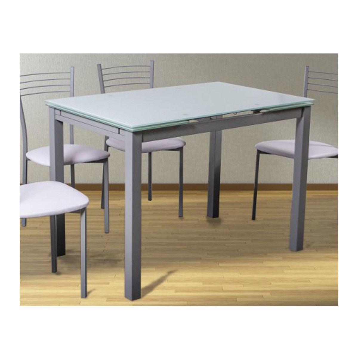 En cuanto a sus características técnicas, la mesa está diseñada con una estructura robusta y resistente, fabricada en metal de alta calidad que garantiza su durabilidad. El acabado en color gris proporciona un contraste atractivo con la tapa de cristal, mientras que las dimensiones compactas de la mesa la hacen adecuada para espacios tanto grandes como pequeños. Los extensibles son fáciles de manejar, permitiendo aumentar la superficie de la mesa de manera rápida y sencilla, ideal para esos momentos en los que se recibe a más invitados.
