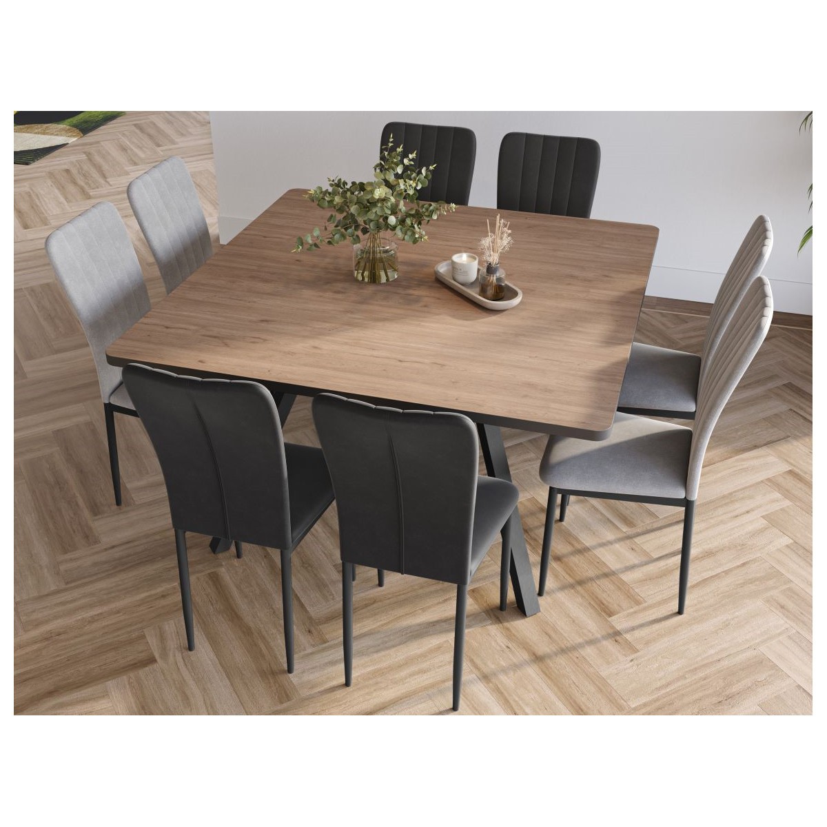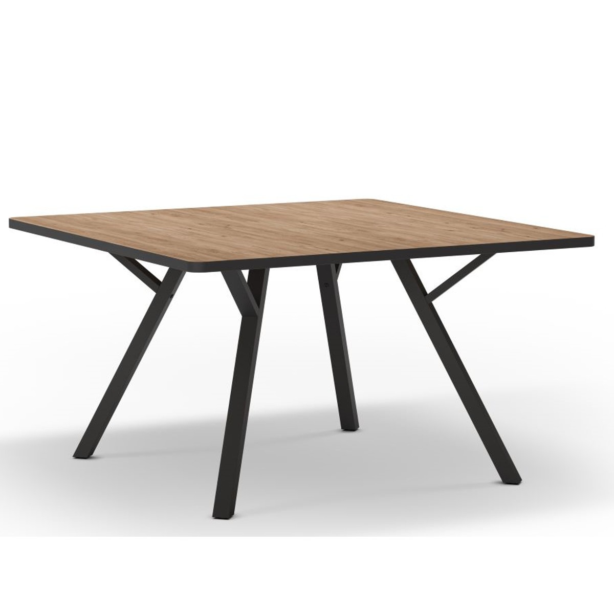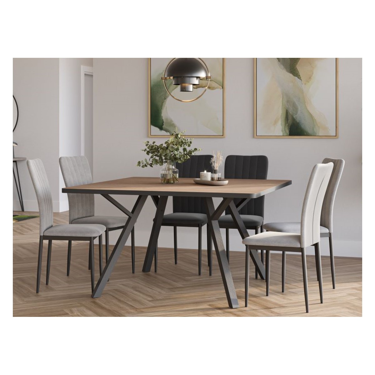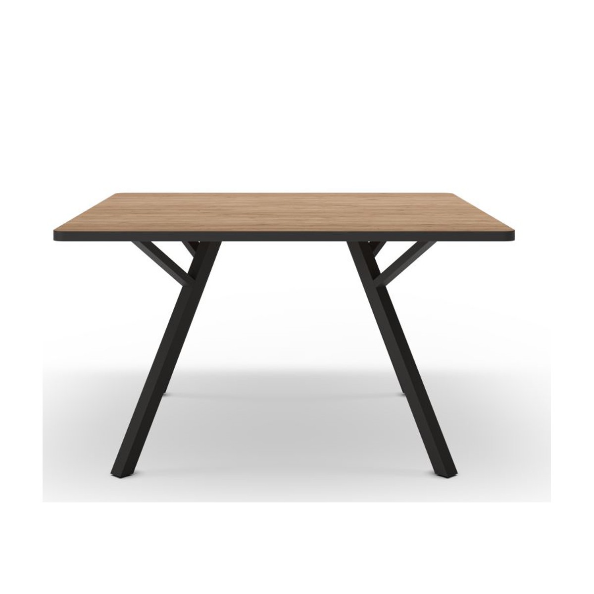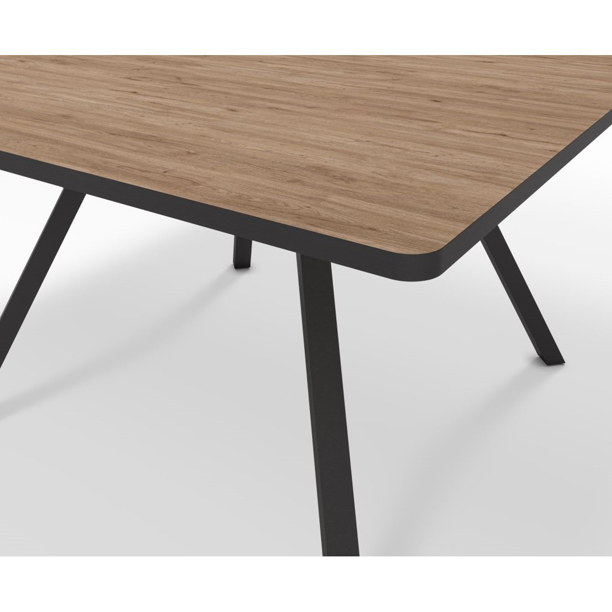 La estructura de la mesa está compuesta por un robusto marco metálico en color negro, que no solo aporta estabilidad, sino que también contrasta elegantemente con la madera. Las patas tienen un diseño angulado que no solo es visualmente atractivo, sino que también facilita el acceso y la comodidad al sentarse. Además, el canto redondeado de la mesa asegura un tacto suave y previene accidentes, haciendo de esta mesa una opción segura para familias con niños.