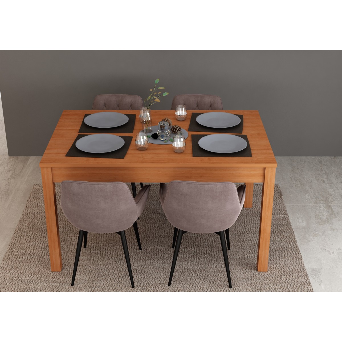 La Mesa de comedor SAVA de 138x90 cm es una pieza clave para cualquier comedor moderno. Con un elegante acabado en cerezo savannah, esta mesa combina un diseño contemporáneo con un toque industrial, convirtiéndola en la opción perfecta para 4-6 personas. Su estética urbana la hace ideal para espacios que buscan un estilo sofisticado y acogedor. El contraste entre el acabado cálido de la madera y las sillas de terciopelo gris aporta un equilibrio visual que realza cualquier decoración.