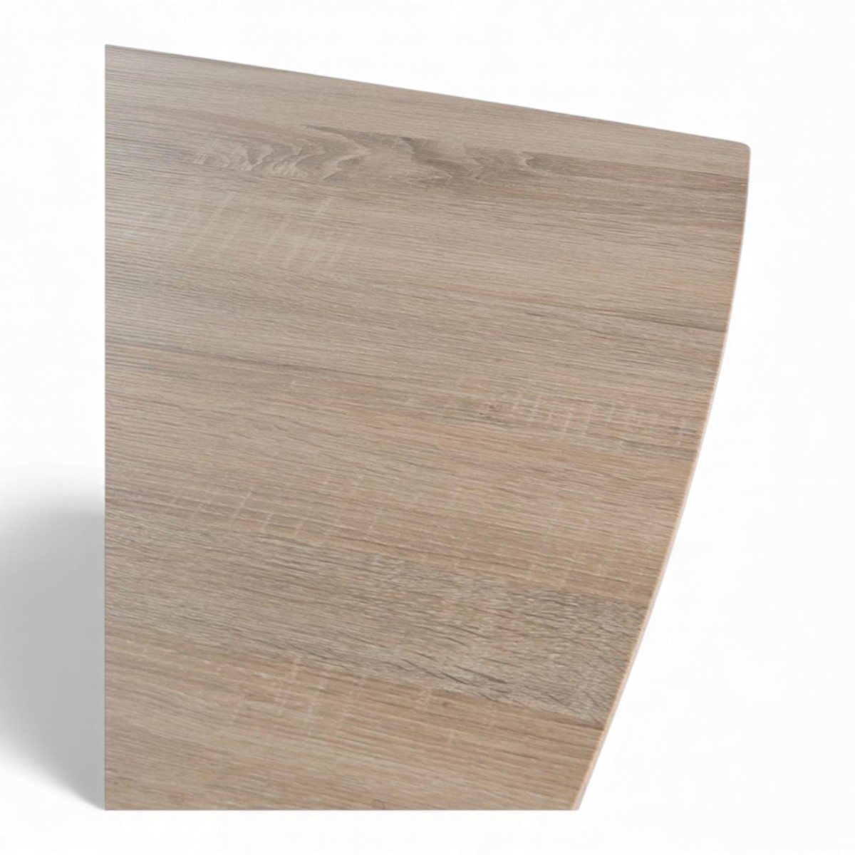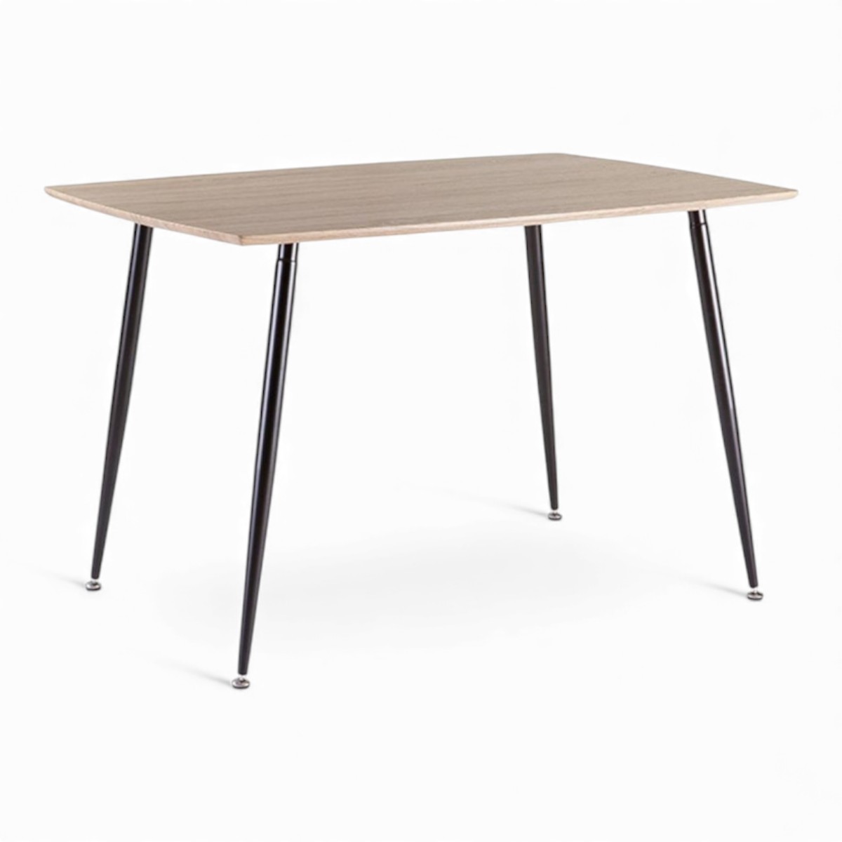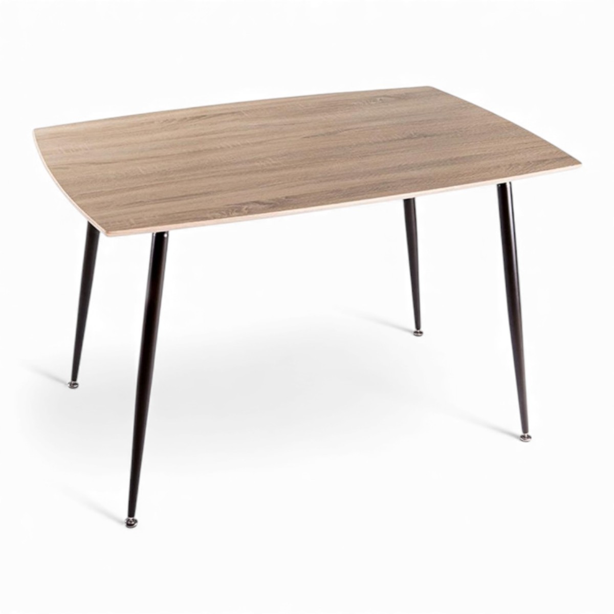 Visualmente, la mesa destaca por la combinación de su superficie de madera clara, que presenta un acabado suave y una textura agradable al tacto, y las patas estilizadas que le confieren un aire moderno. La forma ligeramente redondeada de los bordes de la tapa no solo añade un elemento estético, sino que también ofrece seguridad y comodidad. Este contraste entre la madera y el metal resulta en una pieza versátil que se adapta a diferentes estilos de decoración, desde el nórdico hasta el industrial.