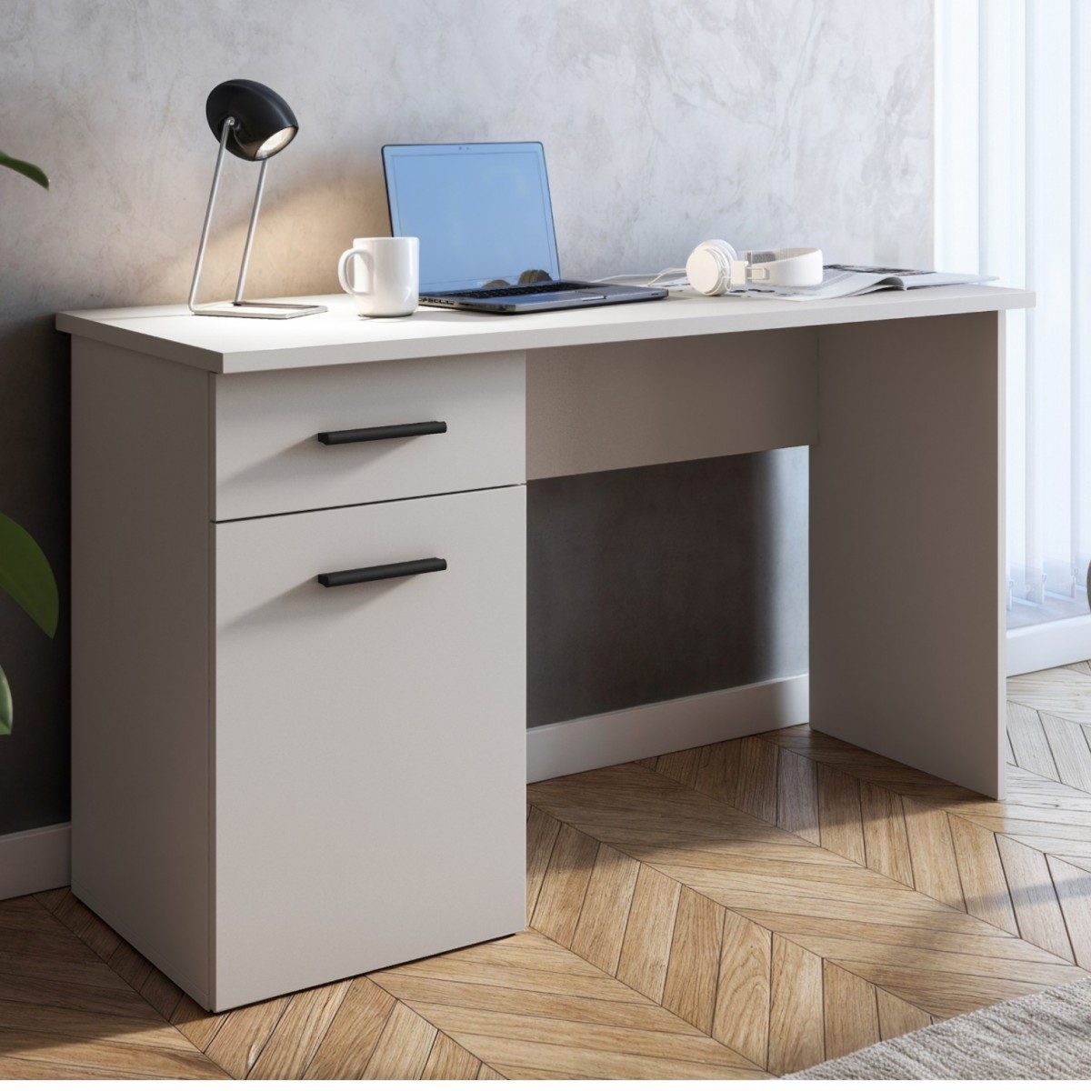 Visualmente, la mesa destaca por su superficie de melamina de alta calidad, que proporciona un acabado suave y duradero. Las esquinas redondeadas y el tirador negro en los cajones añaden un toque de sofisticación, creando un contraste elegante con el color beige. Además, su diseño abierto en la parte inferior permite una ventilación adecuada, manteniendo el área de trabajo ordenada y libre de desorden. La mesa está equipada con dos cajones, perfectos para almacenar tus útiles de oficina y mantener todo al alcance de la mano.