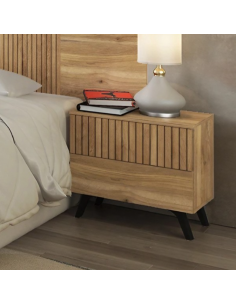 Fabricada en materiales de alta calidad, la mesita cuenta con dos cajones amplios que ofrecen un espacio de almacenamiento práctico y accesible. Las tiradores de metal en acabado plateado aportan un toque contemporáneo y facilitan la apertura de los cajones. Además, su superficie superior es perfecta para colocar lámparas, libros o dispositivos móviles, asegurando que todo lo que necesitas esté siempre a mano.