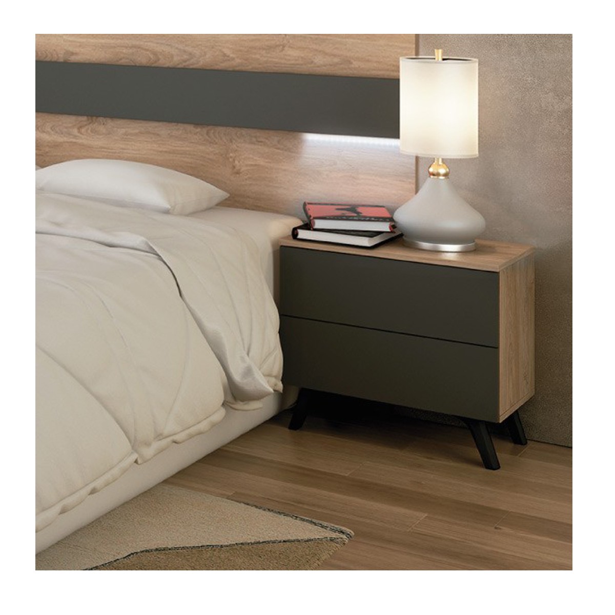 Fabricada con materiales de alta calidad, la mesita presenta un cuerpo robusto que garantiza durabilidad. Los dos cajones ofrecen un amplio espacio de almacenamiento, permitiendo mantener el orden y la organización en tu entorno. El acabado en color gris oscuro de la parte frontal de los cajones se complementa con el tablero superior en un tono de madera natural, aportando un equilibrio perfecto entre modernidad y calidez. Sus patas en ángulo, también en color negro, añaden un toque distintivo y estilizado.