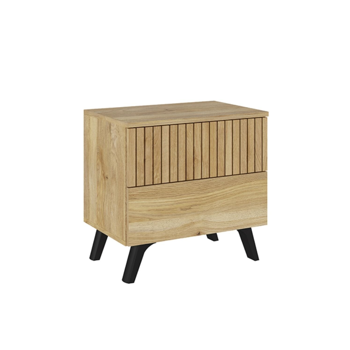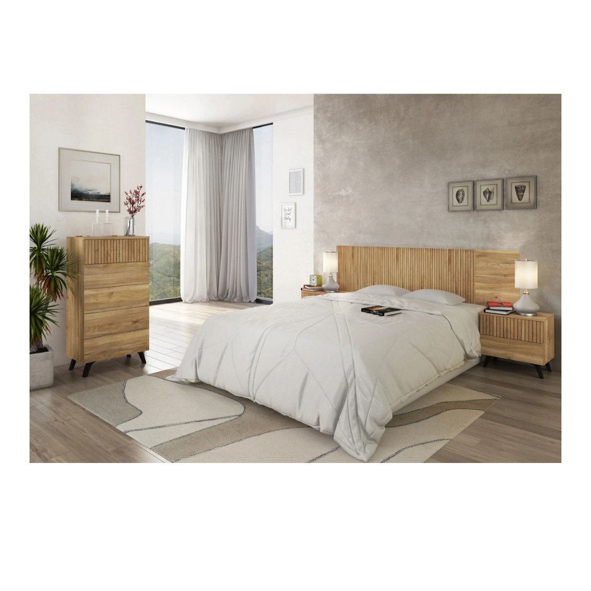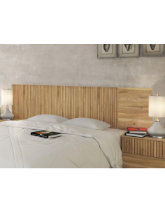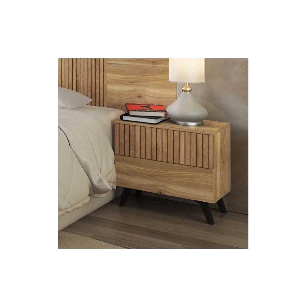 Visualmente, la mesita destaca por sus líneas limpias y un acabado en tonos madera que proporciona un aire natural. Su superficie superior es ideal para colocar lámparas, libros o elementos decorativos, mientras que los dos amplios cajones ofrecen un excelente espacio de almacenamiento. Las ranuras verticales en la parte frontal de los cajones no solo brindan un aspecto distintivo, sino que también facilitan la apertura y el cierre. En conjunto, estos detalles hacen de la Mesita de Noche 2c Solana una elección sofisticada y funcional.
