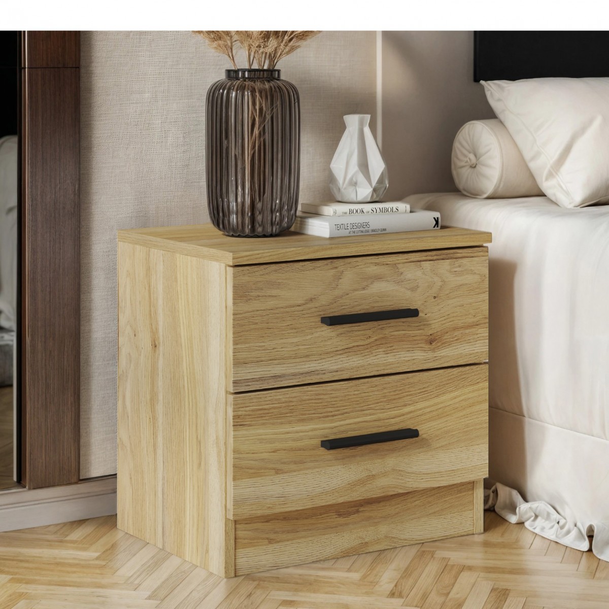Con un diseño que prioriza la funcionalidad, esta mesita incluye dos cajones espaciosos que permiten un almacenamiento eficiente. Sus dimensiones compactas permiten que se integre sin problemas en cualquier rincón del dormitorio, haciendo que cada centímetro cuente. La mesita está diseñada para ser versátil, adaptándose a diferentes estilos decorativos, desde el nórdico hasta el contemporáneo.