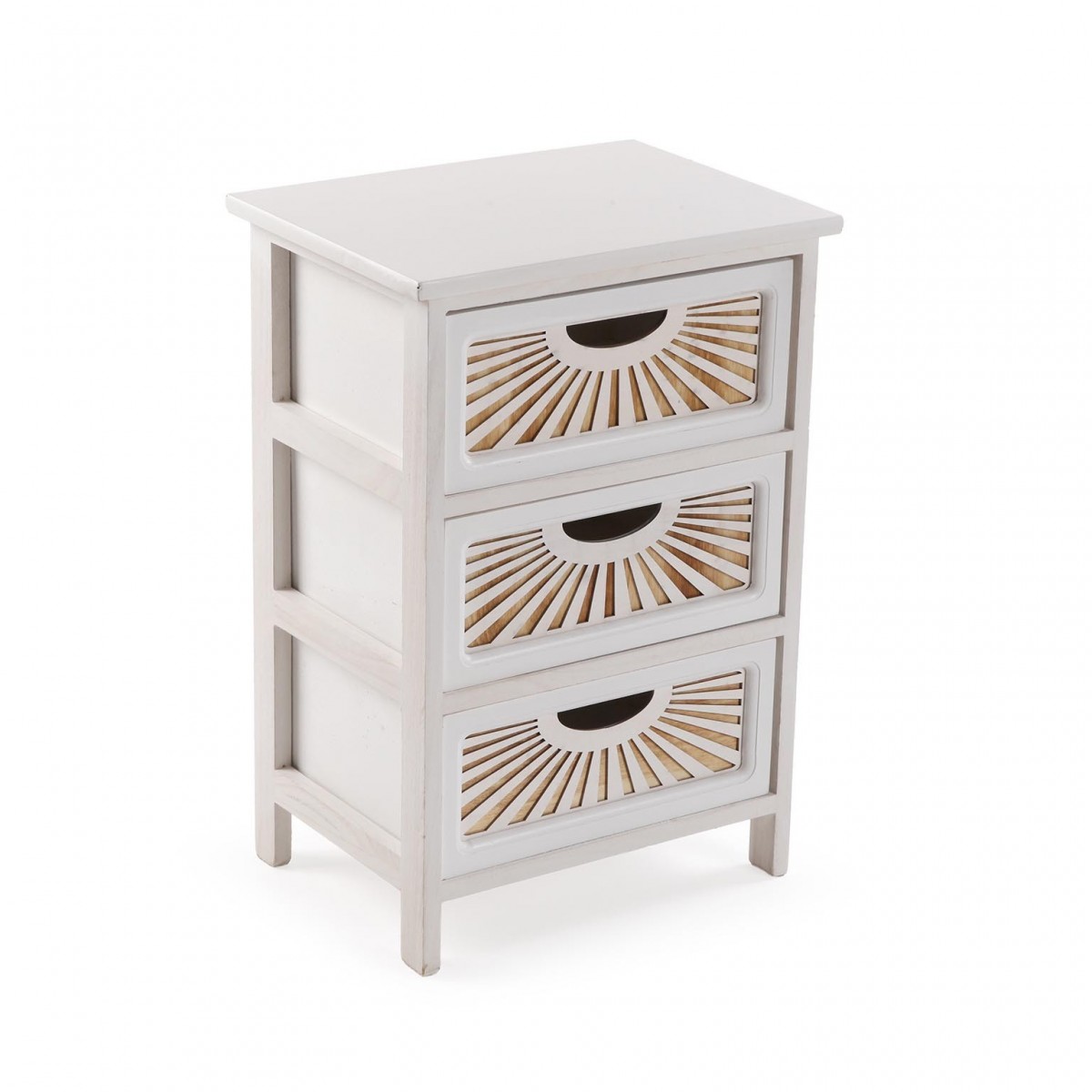 Visualmente, la Cajonera ADDA destaca por su estructura robusta y sus tres cajones con un diseño distintivo. Cada cajón presenta un acabado de madera contrachapada que añade un contraste sutil y atractivo. Los detalles en forma de rayos en la parte frontal de los cajones no solo aportan un elemento visual interesante, sino que también facilitan la apertura. Con unas medidas de 58 cm de alto, 29 cm de ancho y 40 cm de largo, esta cajonera es perfecta para maximizar el espacio sin resultar abrumadora.