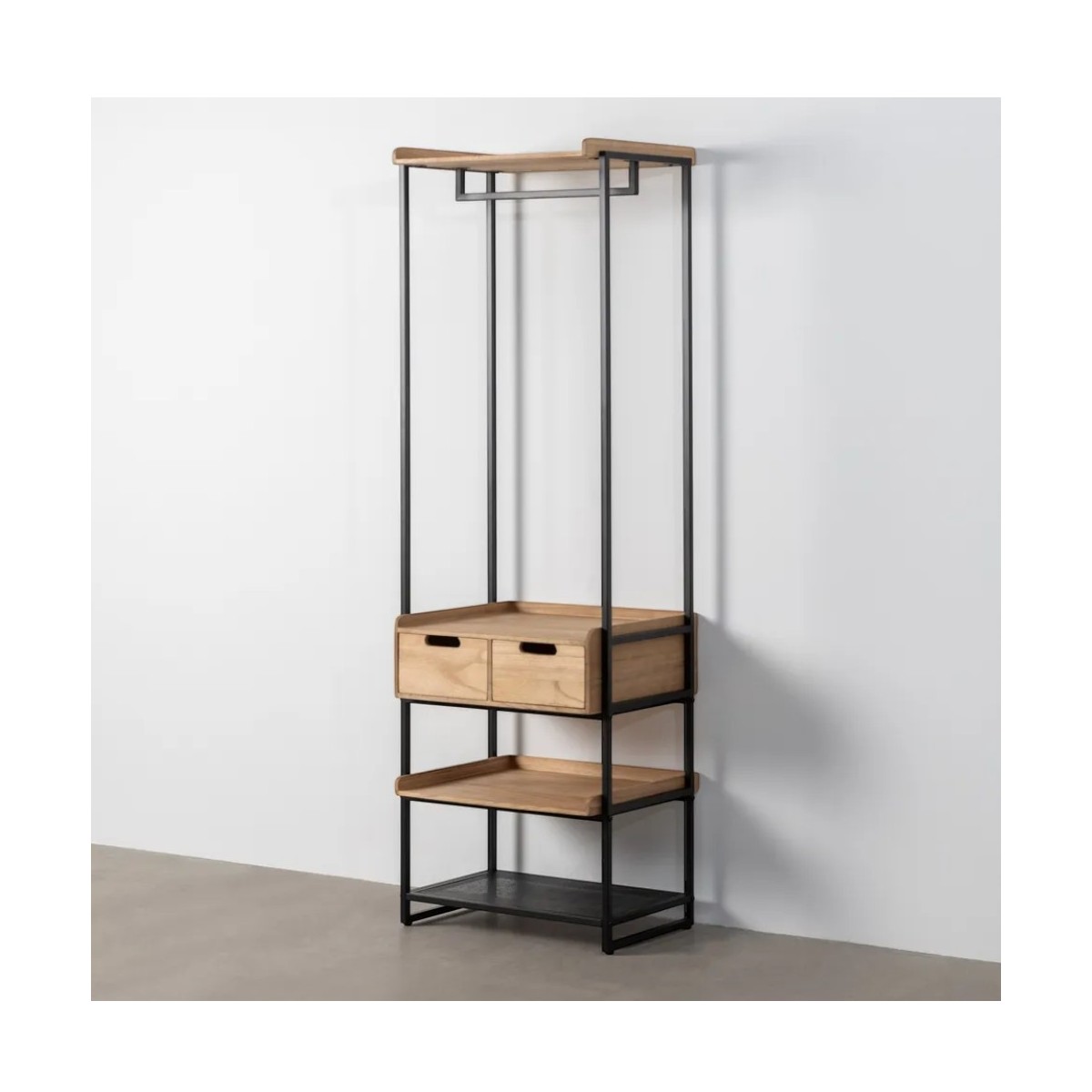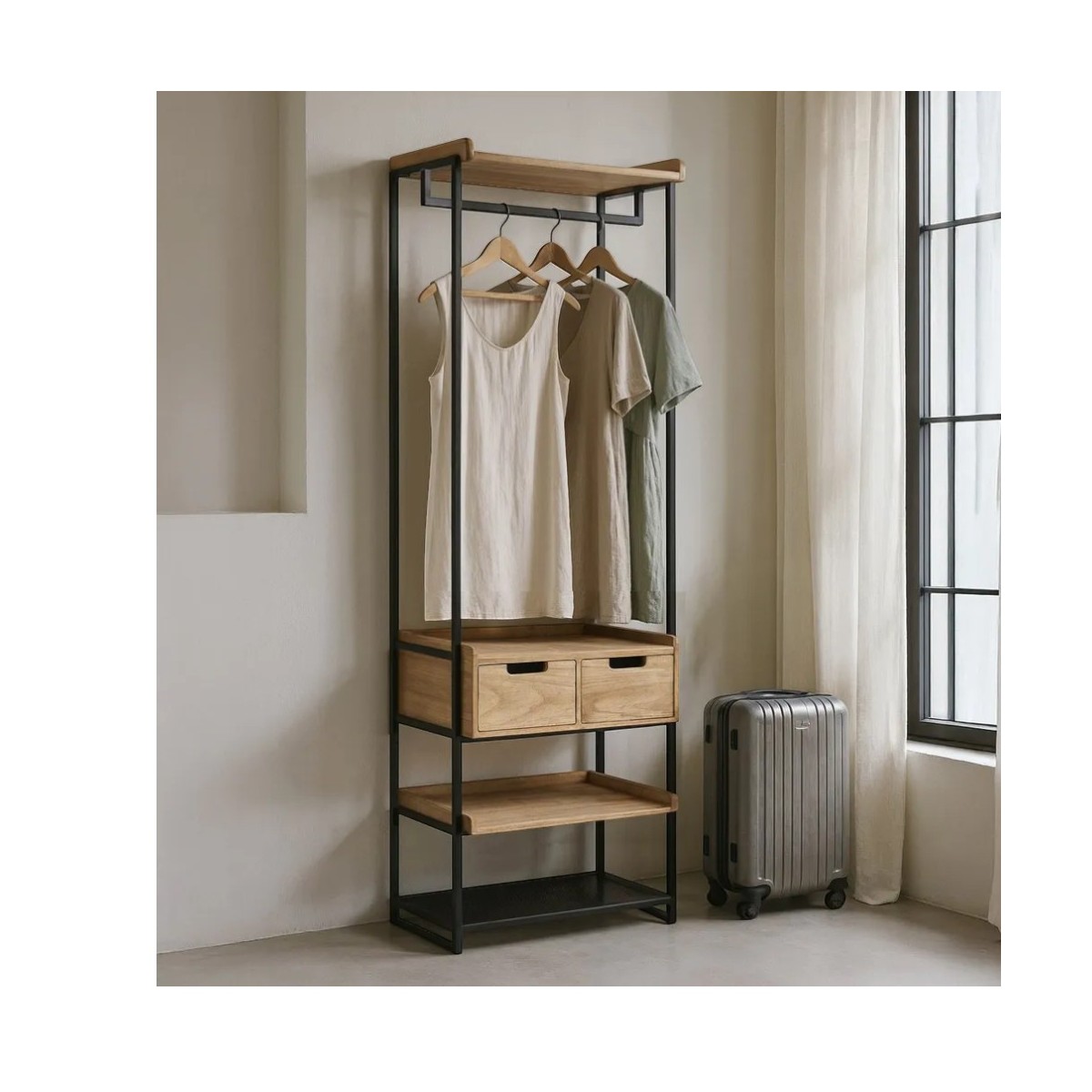 Visualmente, el mueble PETE destaca por su elegante combinación de tonos. La parte superior de madera natural ofrece un espacio ideal para exhibir decoraciones, mientras que la estructura metálica negra proporciona un contraste atractivo. Los cajones, situados en la parte inferior, están diseñados en un acabado similar al de la parte superior, creando una armonía visual que mejora la funcionalidad del mueble. La barra de colgar permite exhibir prendas de vestir de forma ordenada, facilitando el acceso a las mismas.