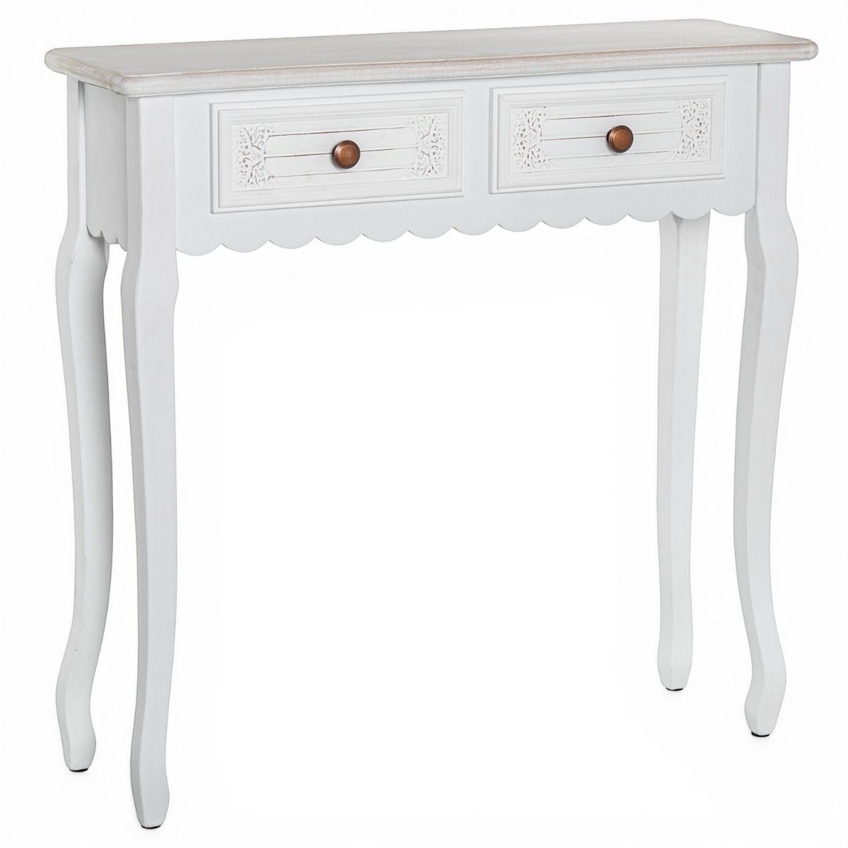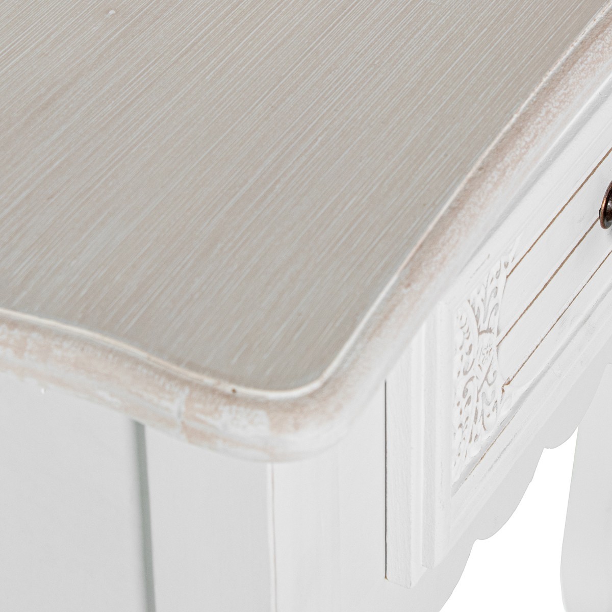 Visualmente, la mesa presenta un acabado en blanco brillante, complementado por un tablero de madera que muestra un tono más claro, creando un hermoso contraste. La forma ligeramente curvada del borde del tablero, junto con los detalles decorativos en los cajones, añaden un encanto acogedor. Los tiradores de los cajones, en un tono marrón cálido, aportan un toque de rusticidad que equilibra la modernidad del diseño.